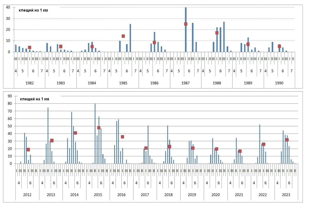 Сезонные (ежедекадные) изменения численности таежного клеща в районе многолетнего мониторинга (Гомсельга, Кондопожский р-н) на протяжении двух периодов наблюдений