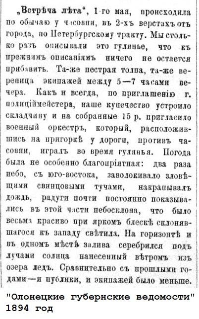 Жители города наряжались в костюмы, вдоль тракта ставились лари с лакомствами, работала карусель. Весь день играл оркестр, к вечеру устраивался фейерверк, а однажды даже запускался цирковой воздушный шар. В подшивках «Олонецких губернских ведомостей» разных лет нам удалось найти публикации о том, как праздновали 1 мая «встречу лета» в губернском Петрозаводске в XIX веке», — написала глава города.