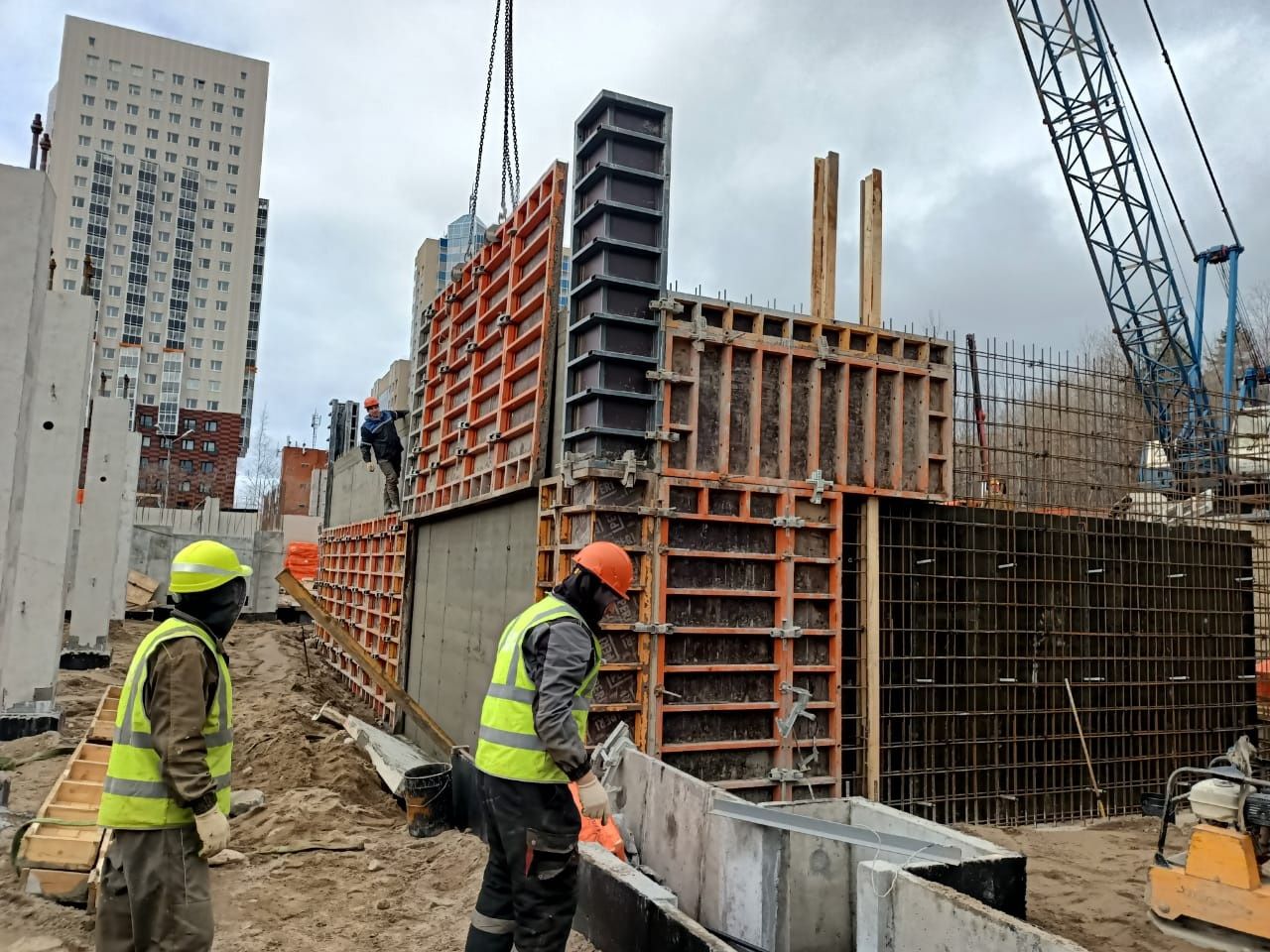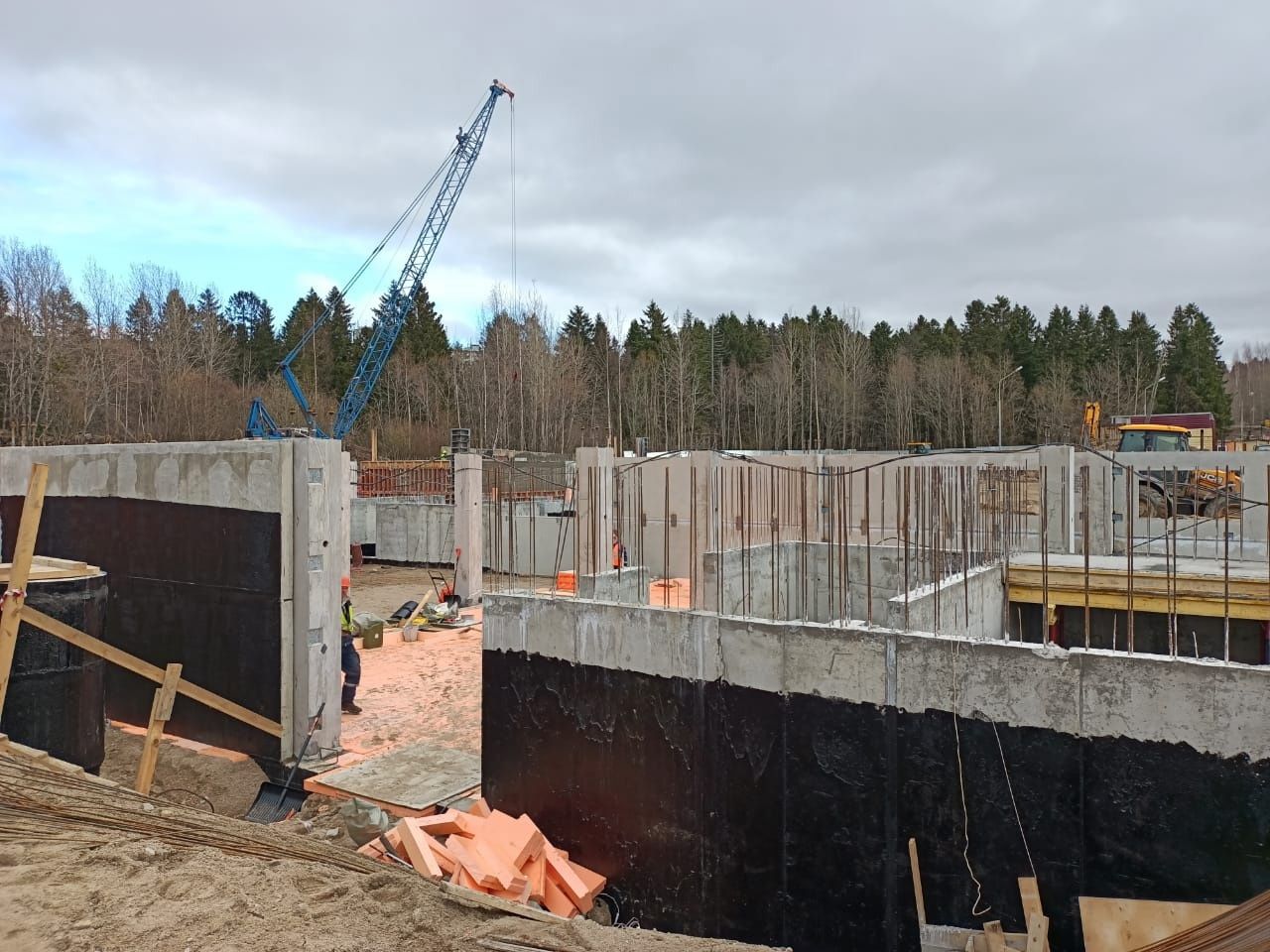 По его словам, строители возводят подвальные помещения, делают лифтовую шахту, входы в подвал, стеновые панели цоколя, готовят основание под заливку полов, смонтирован наружный пристенный дренаж. В мае установят два башенных крана, начнётся возведение этажей.