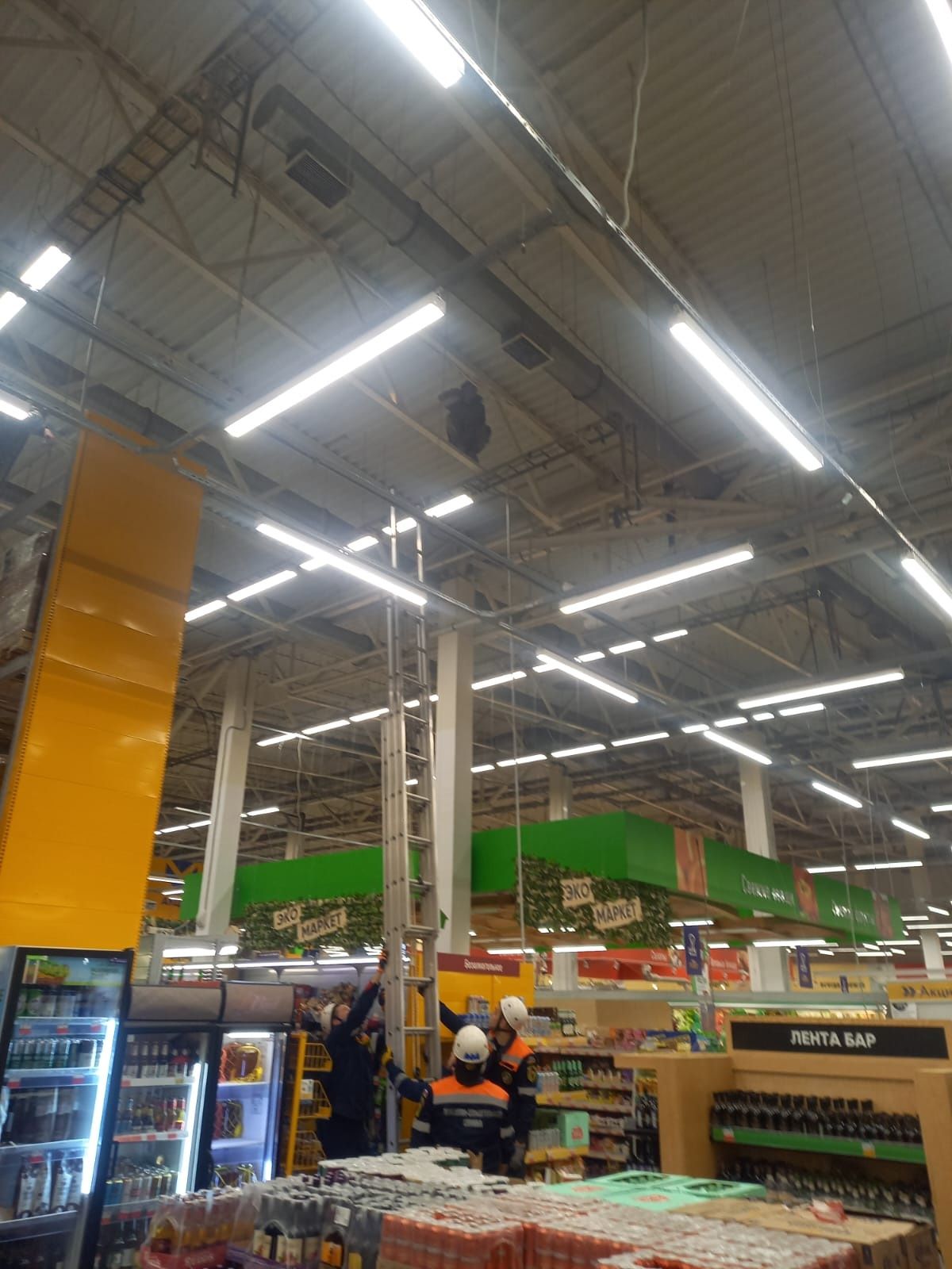 Сегодня утром спасатели снимали мужчину с потолочных конструкций в гипермаркете «Лента».
