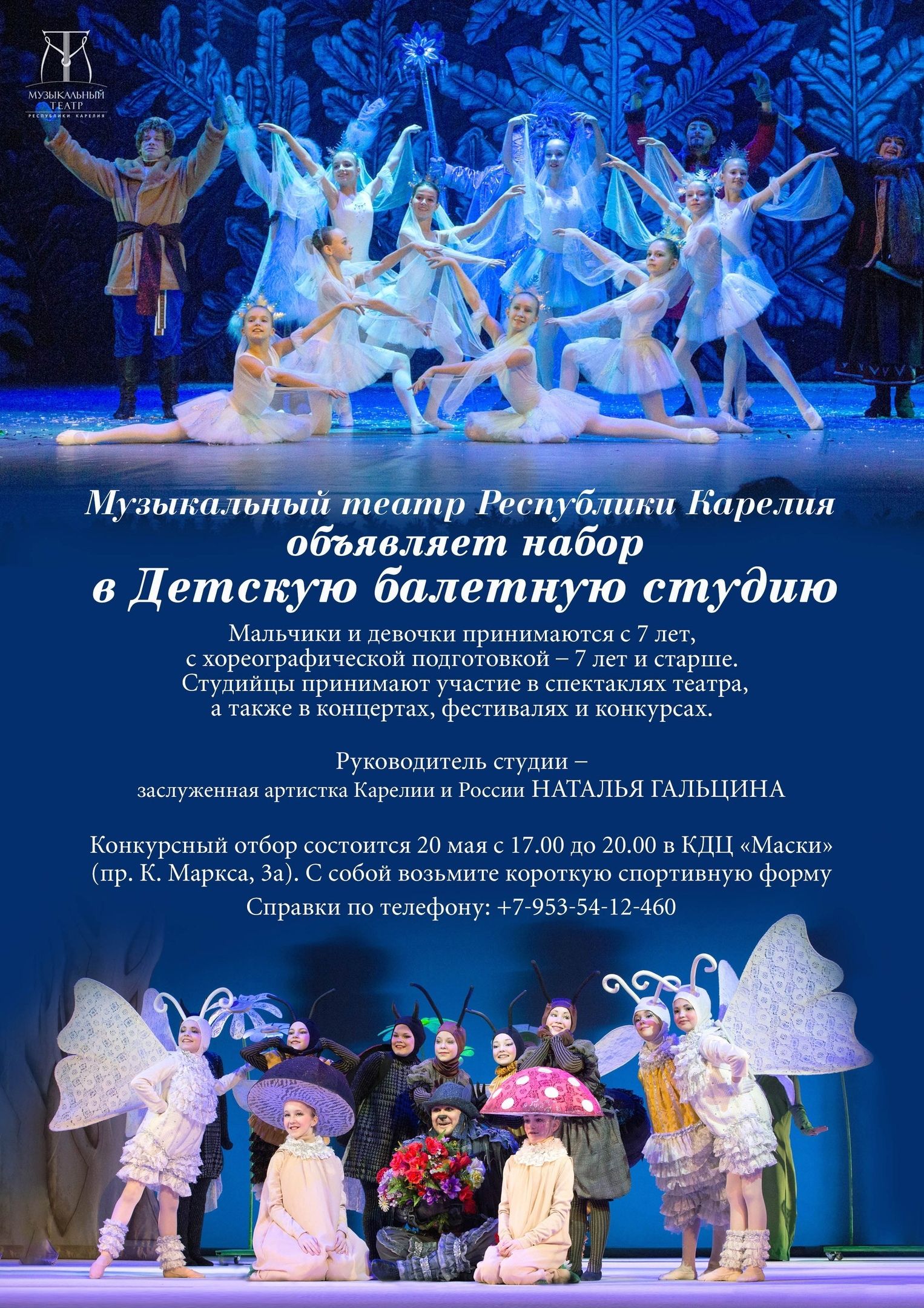 Музыкальный театр Карелии объявляет набор в детскую балетную студию под руководством заслуженной артистки Карелии и России Натальи Васильевны Гальциной. Конкурсный набор воспитанников в балетную студию Музыкального театра Карелии состоится 20 мая с 17.00 до 20.00 в балетном зале КДЦ «Маски». Принимаются мальчики и девочки семи лет, а если у них уже есть хореографическая подготовка, то с семи лет и старше. Подробности конкурса можно узнать по телефонам (814 2) 220-223 доб. 103, +7 953-541-24-60.