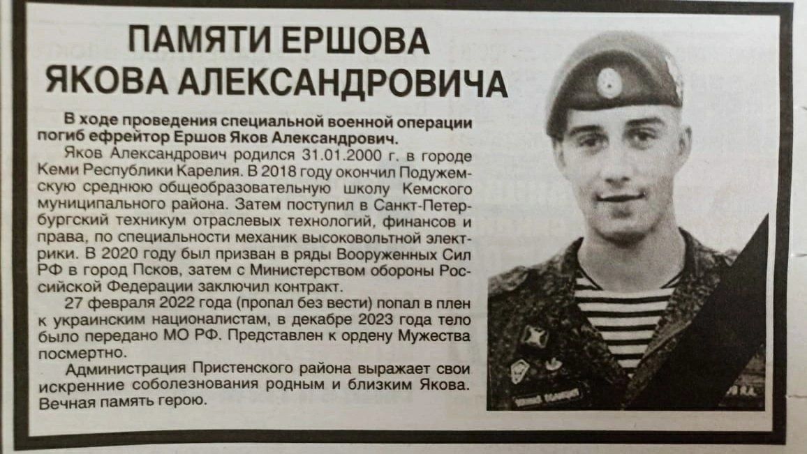 Власти выразили соболезнования в связи с гибелью ефрейтора Ершова Якова Александровича. В коротком сообщении его биография, а также информация, что 27 февраля 2022 года он действительно попал в плен – пропал без вести. И только в декабре 2023 года его тело было передано Министерству обороны России. Сообщается также, что Яков Ершов представлен посмертно к Ордену Мужества. На момент попадания в плен ему было 22 года. Портал «Карелия.Ньюс» попробовал спросить у мамы бойца, была ли какая-то информация о ее сыне за два года, но женщина отказалась общаться.
