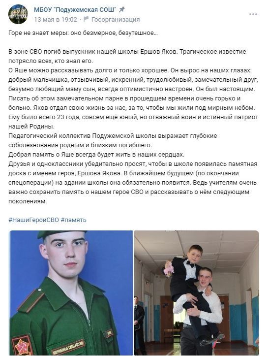 О гибели в ходе СВО выпускника Подужемской школы Кемского района Якова Ершова 13 мая сообщила сама школа. Мы публиковали эту новость. Трагическое известие потрясло всех, кто знал его, сообщили в школе.