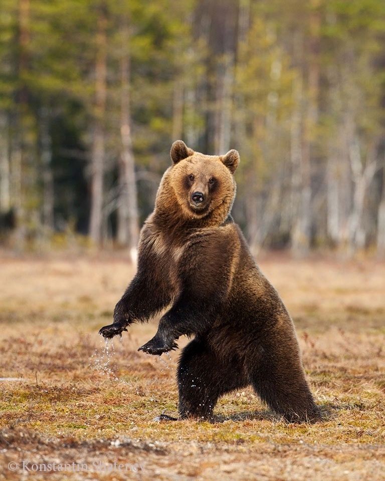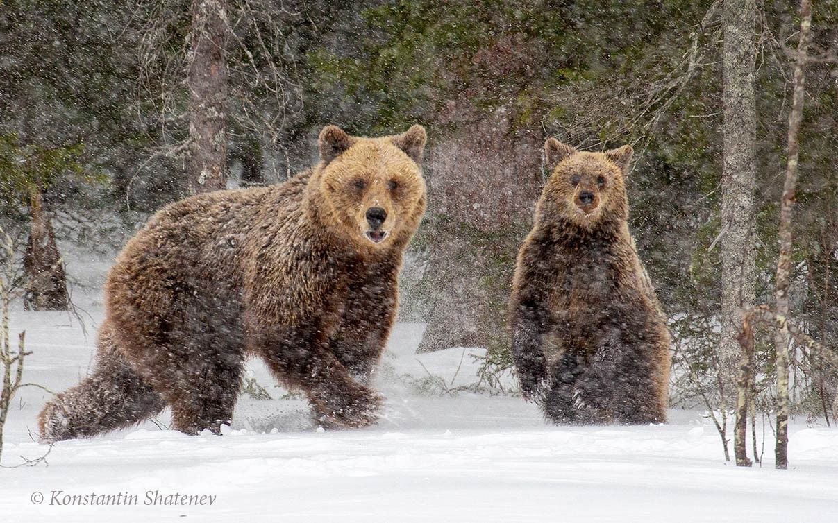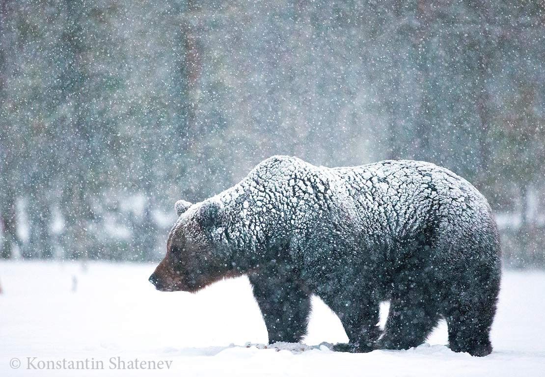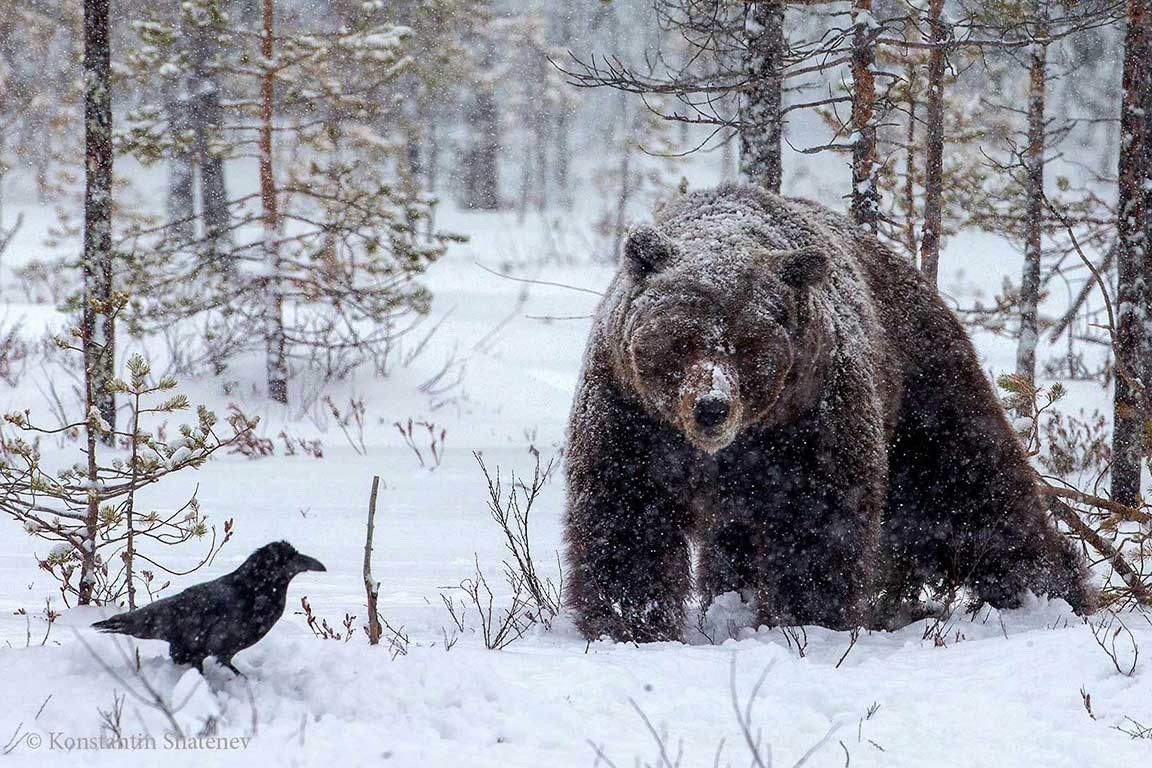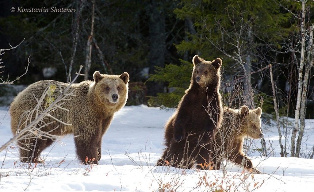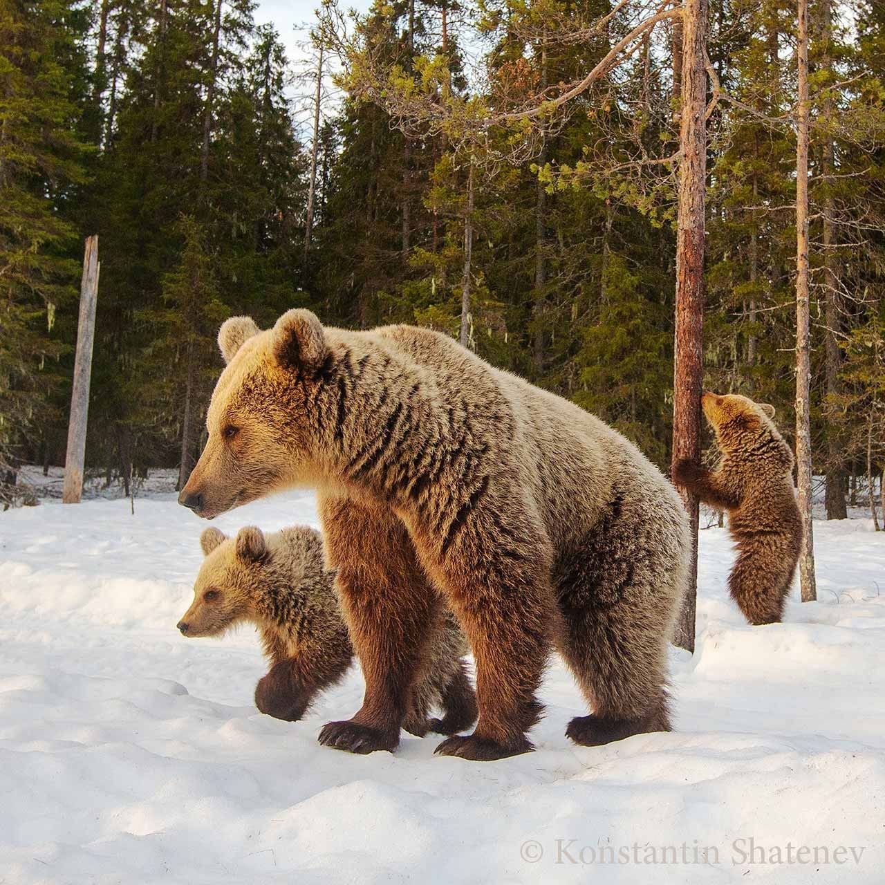 «Медвежьи» кадры Константина нет-нет и мелькают в карельской новостной ленте. То медвежата обступили маму-медведицу, то взобрались на дерево, то взрослый медведь бредет по заснеженной опушке, сопротивляясь ветру, а вот он же и крупным планом. Часто Константин сопровождает фото своими рассказами. За 12 лет он много чего повидал и узнал. Так, наиболее опасна медведица с медвежатами-сеголетками (до 4-х месяцев), говорит он.