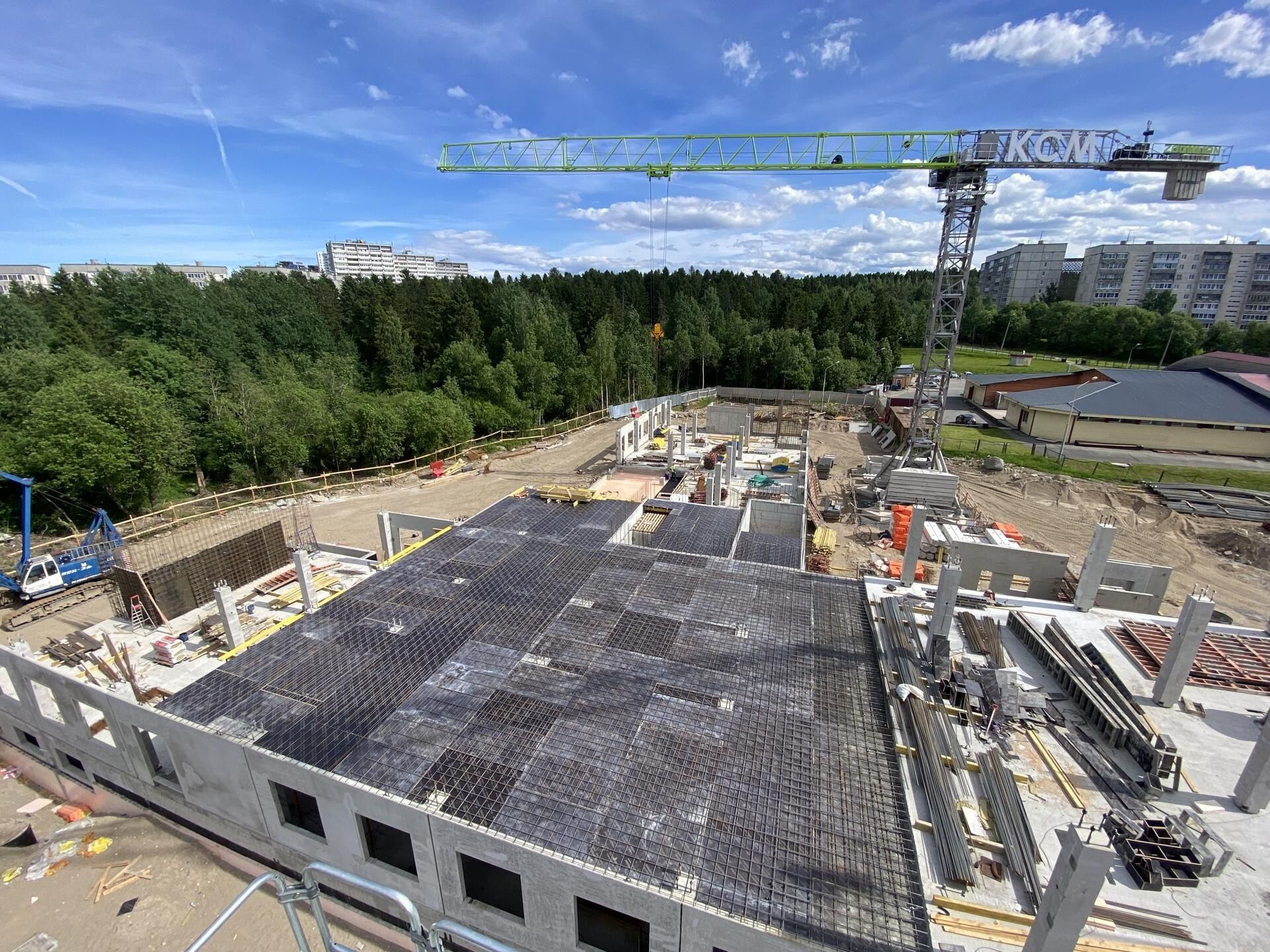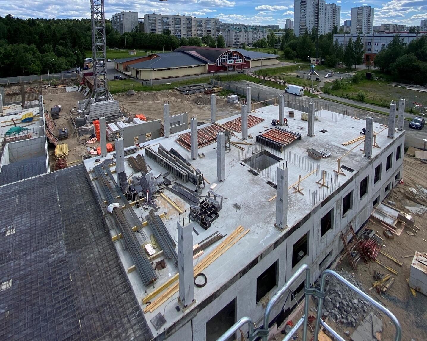 Строители уже поднимают второй этаж — бетонируют наружные стены, армируют плиты, проводят работы по гидроизоляции и устройству полов.