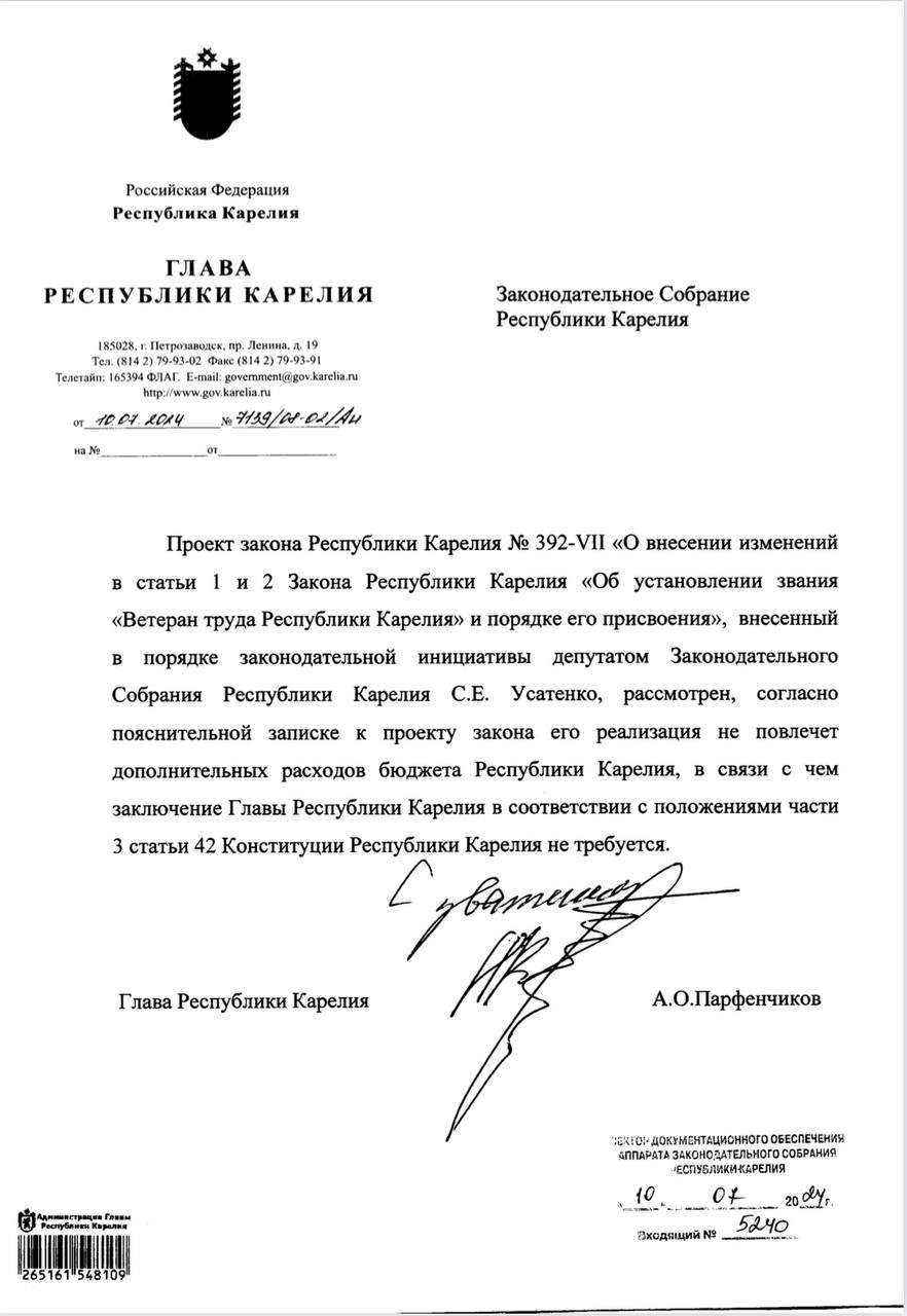 Законопроект, который внес молодой депутат от партии «Новые люди» Сергей Усатенко, вызвал настоящий резонанс. 9 июля депутаты отправили его на заключение главе Карелии, но Артур Парфенчиков предпочел не давать никакого заключения, сославшись, что раз закон не несет никаких бюджетных трат, то и заключение не требуется. Соответствующий документ он прислал депутатам.
