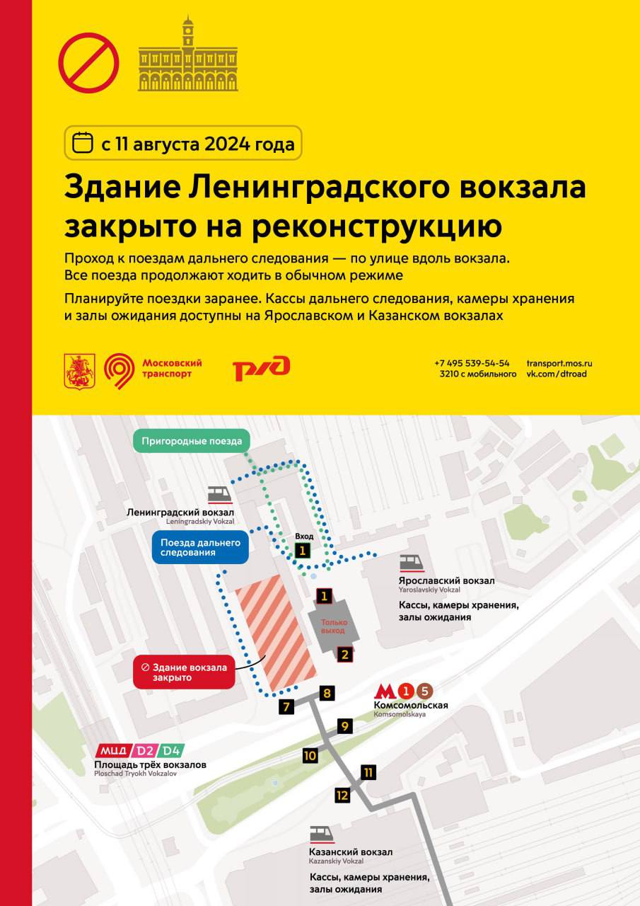 Поезда продолжат прибывать на вокзал и отправляться с него по расписанию, но путь к ним изменится. Залы ожидания, кассы и другие услуги будут доступны на Казанском и Ярославском вокзалах.