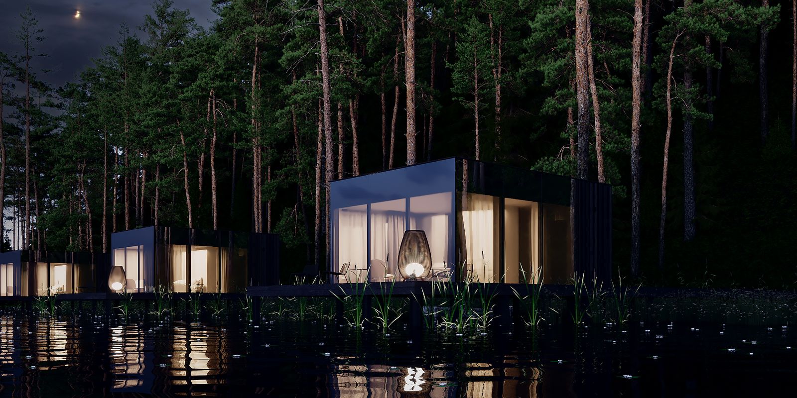 — 4 зеркальных дома на воде;