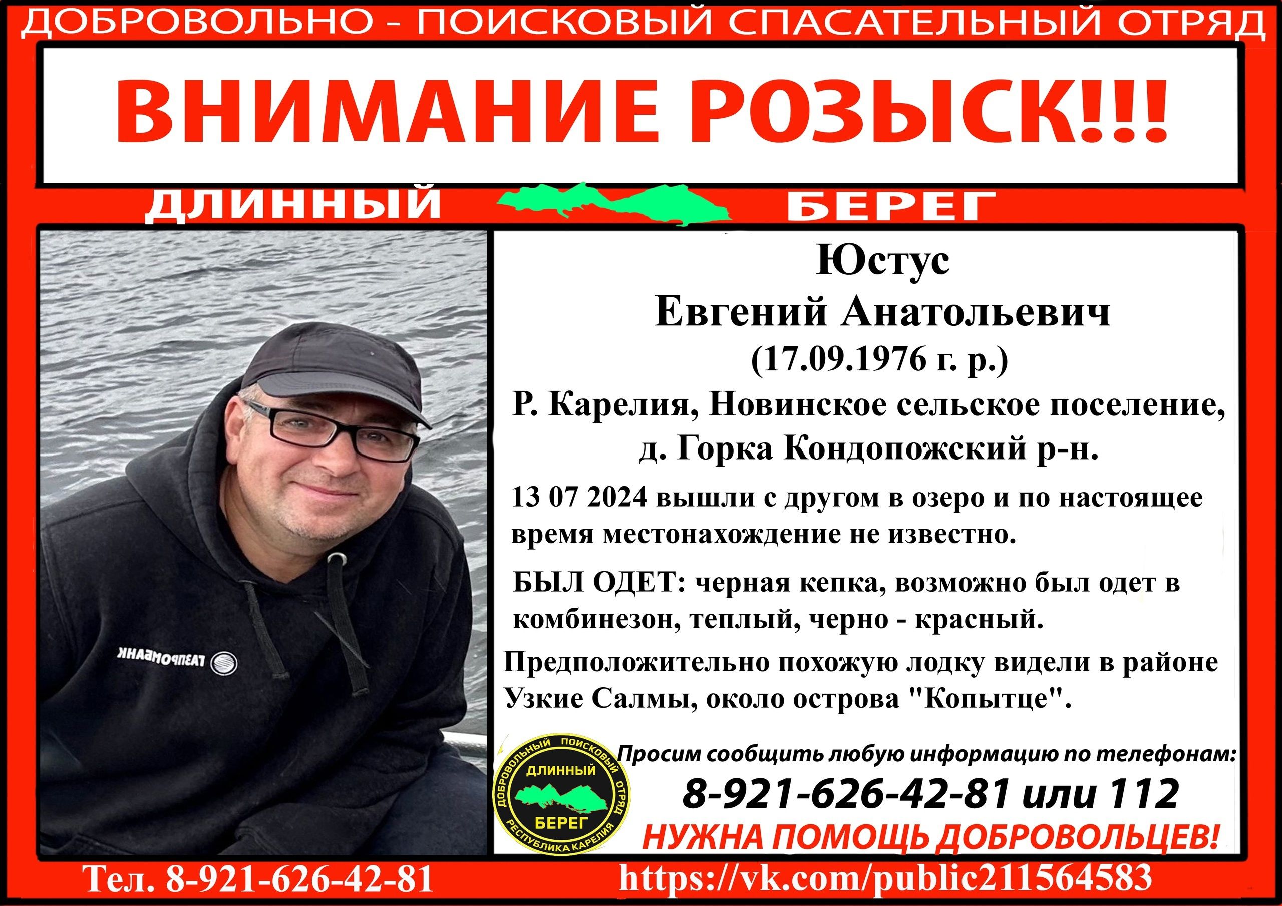 Организованный выезд на поиск Юстуса Евгения состоится 26 июля в 6:00 из Питкяранты. Нужны люди, лодки, эхолоты структур сканер, уточнили в поисковом отряде.