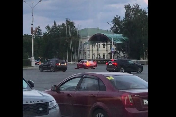 На кадрах видно, как из-под капота припаркованного автомобиля появляется дым, и водитель выходит из салона. Через несколько секунд вспыхивает огонь.