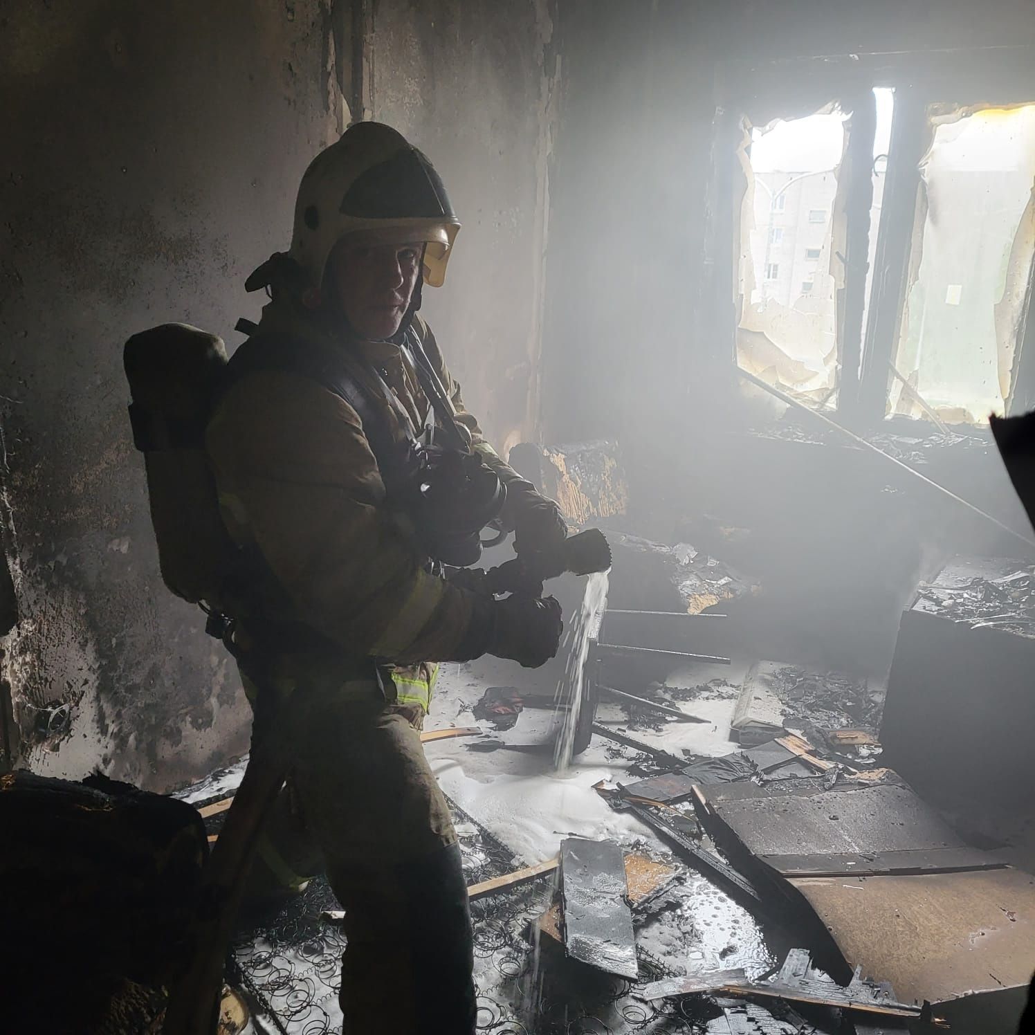 Квартира сильно повреждена огнем.