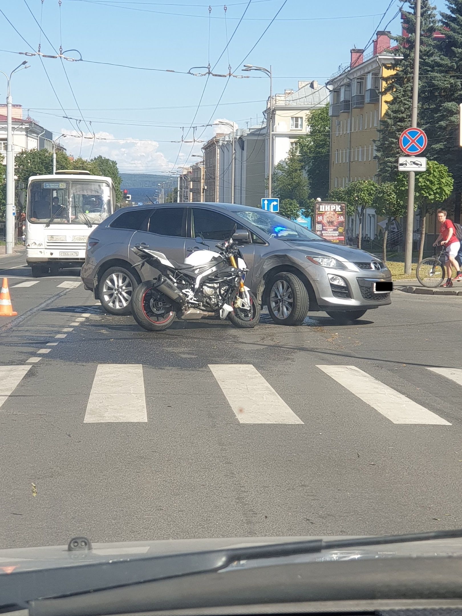 Авария произошла в 13:18 10 августа на проспекте Ленина. Мотоциклист на большой скорости врезался в стоявшую машину и перелетел через нее. Момент ДТП попал попал на камеру «Ситилинк», очевидец прислал в редакцию портала фото с места происшествия.