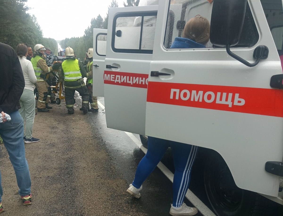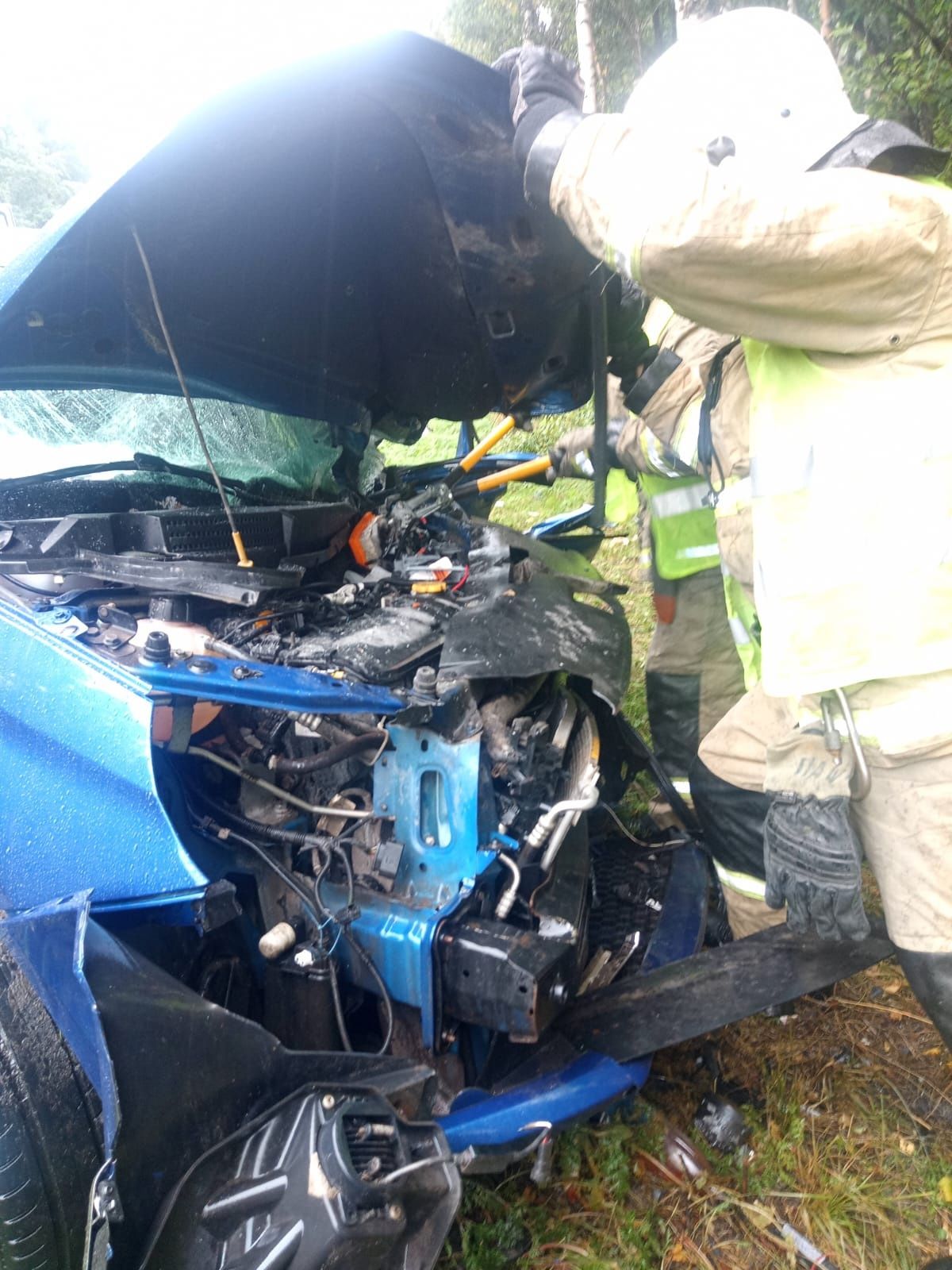 По прибытию на место пожарные осмотрели место ДТП, отключили аккумуляторы, транспортировали пострадавшего до автомобиля скорой, а также смыли техническую жидкость с проезжей части автомобильной дороги. В аварии пострадало два человека.