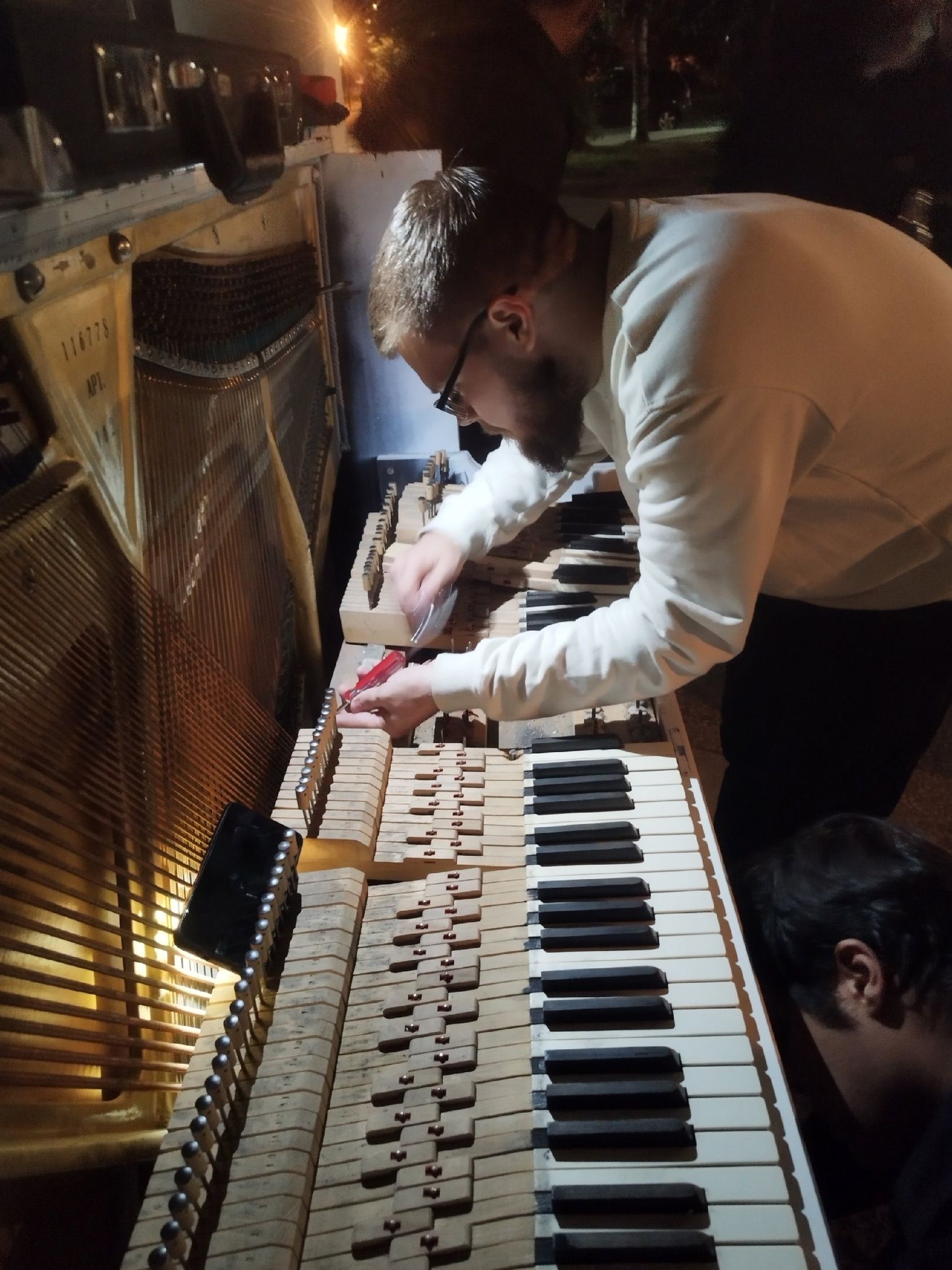 В итоге связался с руководителем проекта Открытое пианино в Ротонде Антоном Сергеевым и предложил настроить инструмент. Делал это ночью, чтобы желающих поиграть было поменьше. Заняло это 8 часов. Была проведена работа со струнами(устранение «завываний» и звона), две настройки с выравниванием строя, шлифовка молотков, регулировка клавиатуры и механики, попутно мелкий ремонт разных деталей.