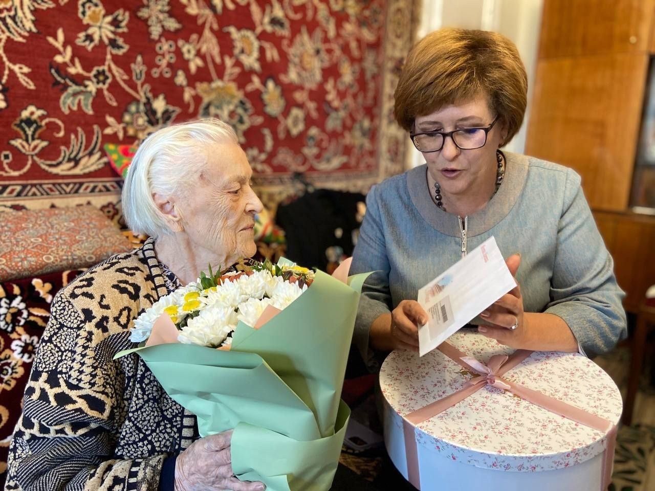 Участнице Великой Отечественной войны петрозаводчанке Октябрине Ивановне Леоновой министр соцзащиты Карелии Ольга Соколова передала персональное поздравление от Владимира Путина, а также цветы и подарок.