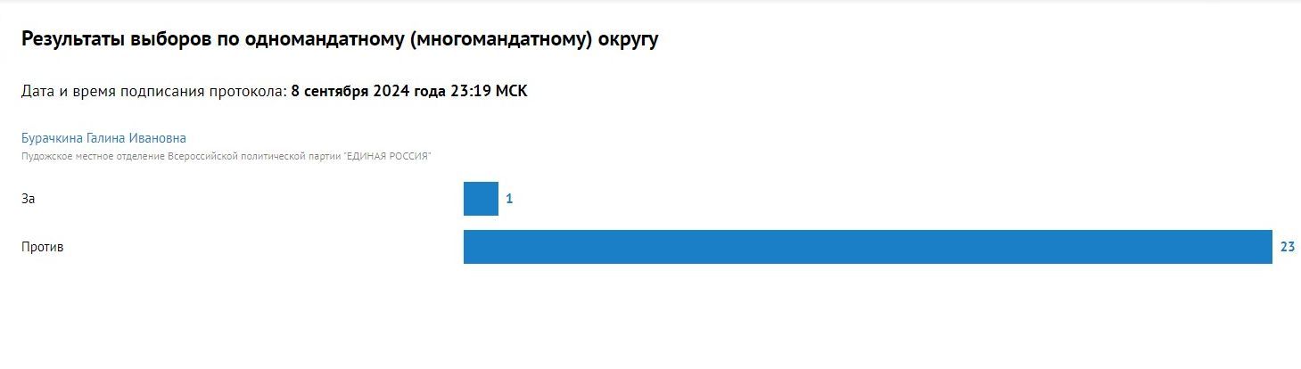 Так, не состоялись выборы депутата Совета Пяльмского сельского поселения пятого созыва по одномандатному избирательному округу № 9. Дело в том, что в бюллетень была внесена одна кандидатура. За депутатское кресло сама с собой боролась пенсионер Галина Бурачкина. Но не смогла победить. Как сообщили в ЦИК, против нее проголосовало большее количество избирателей, чем за нее. Мы заглянули в итоговую таблицу. За Бурачкину, к слову, идущую от «ЕР», был отдан один голос (не ее ли самой?), а против высказались 23 избирателя.