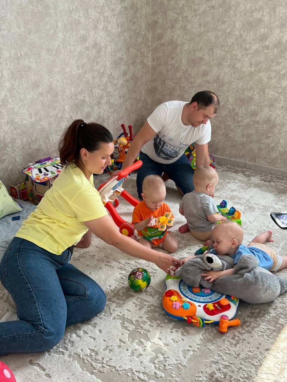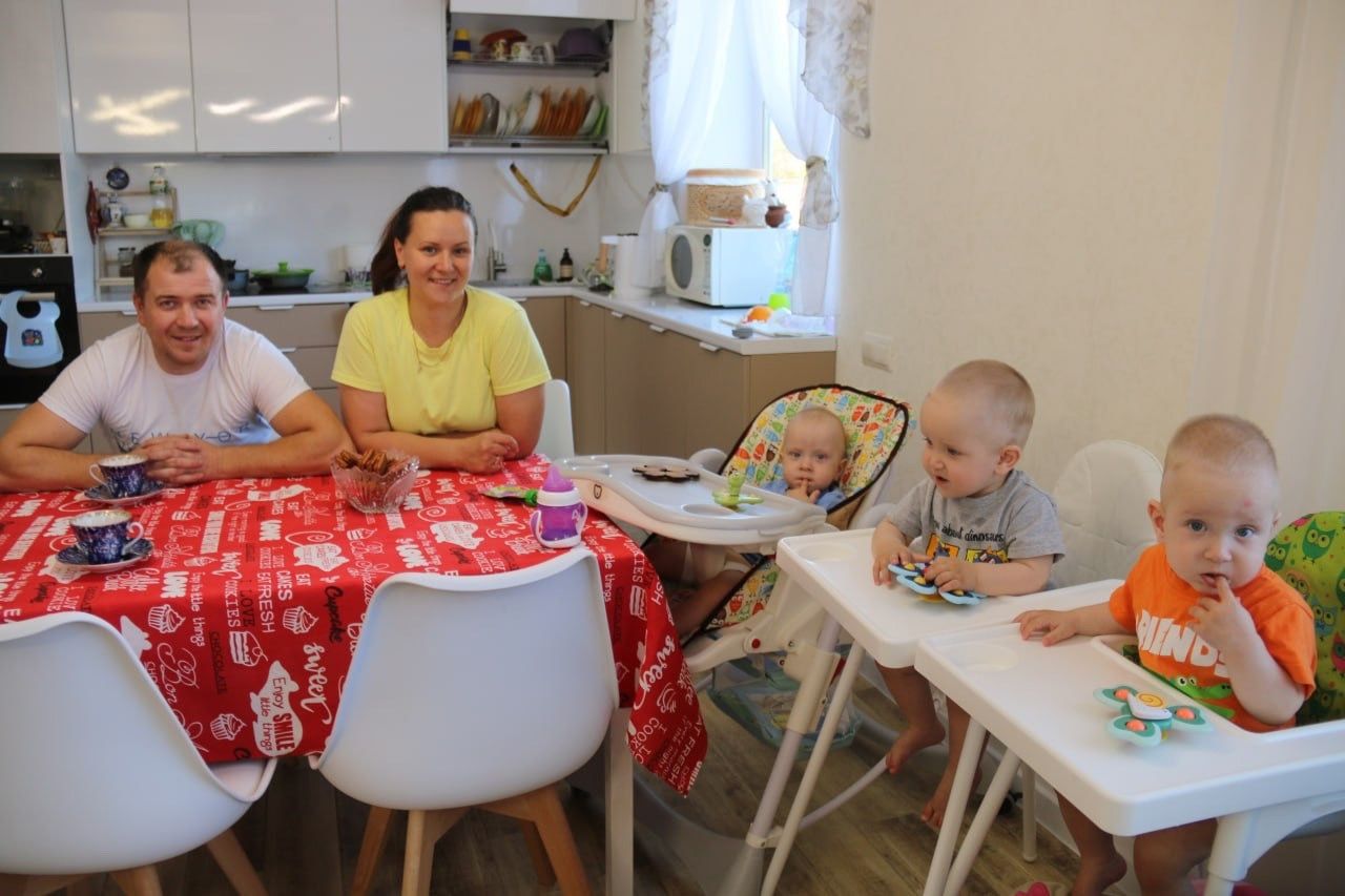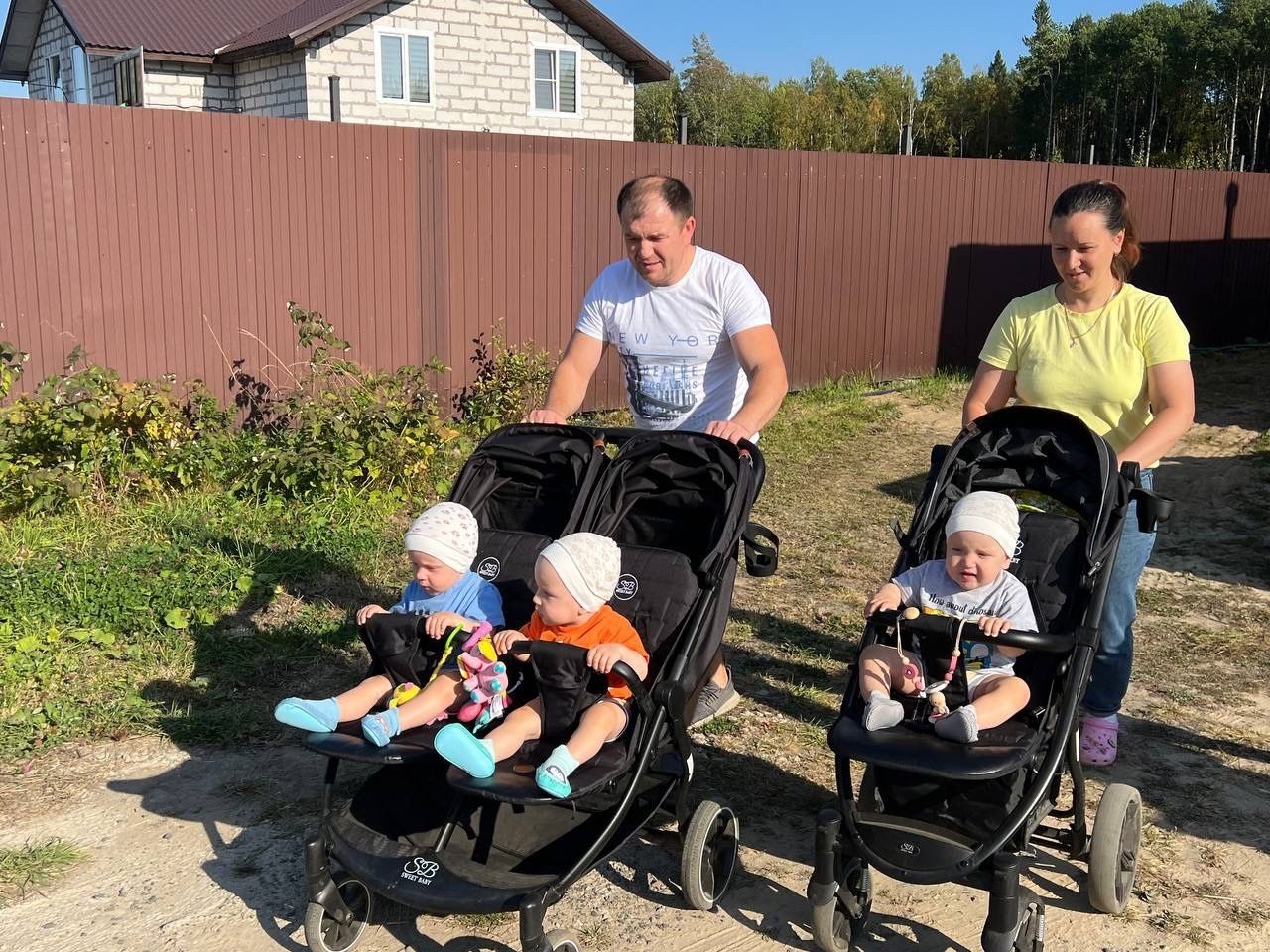 Тройняшки Витя, Матвей и Тимоша уже научились ходить, поэтому за ними нужен постоянный присмотр. Родителям помогают бабушки, которые всегда готовы прийти на помощь. Семье пожелали счастья, здоровья и сил.