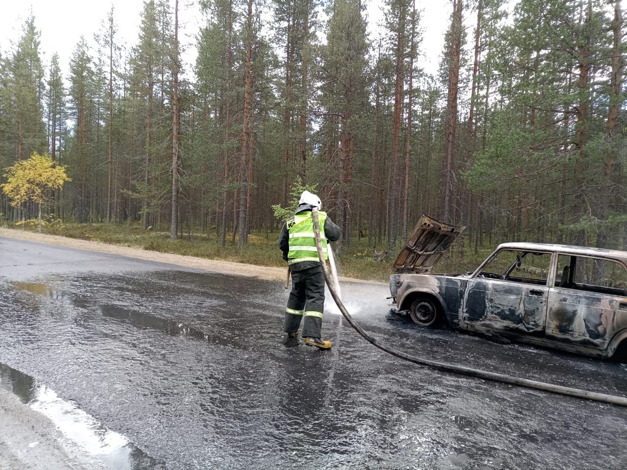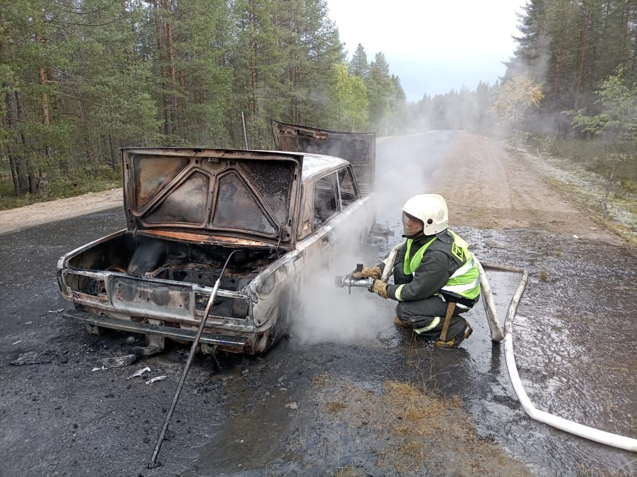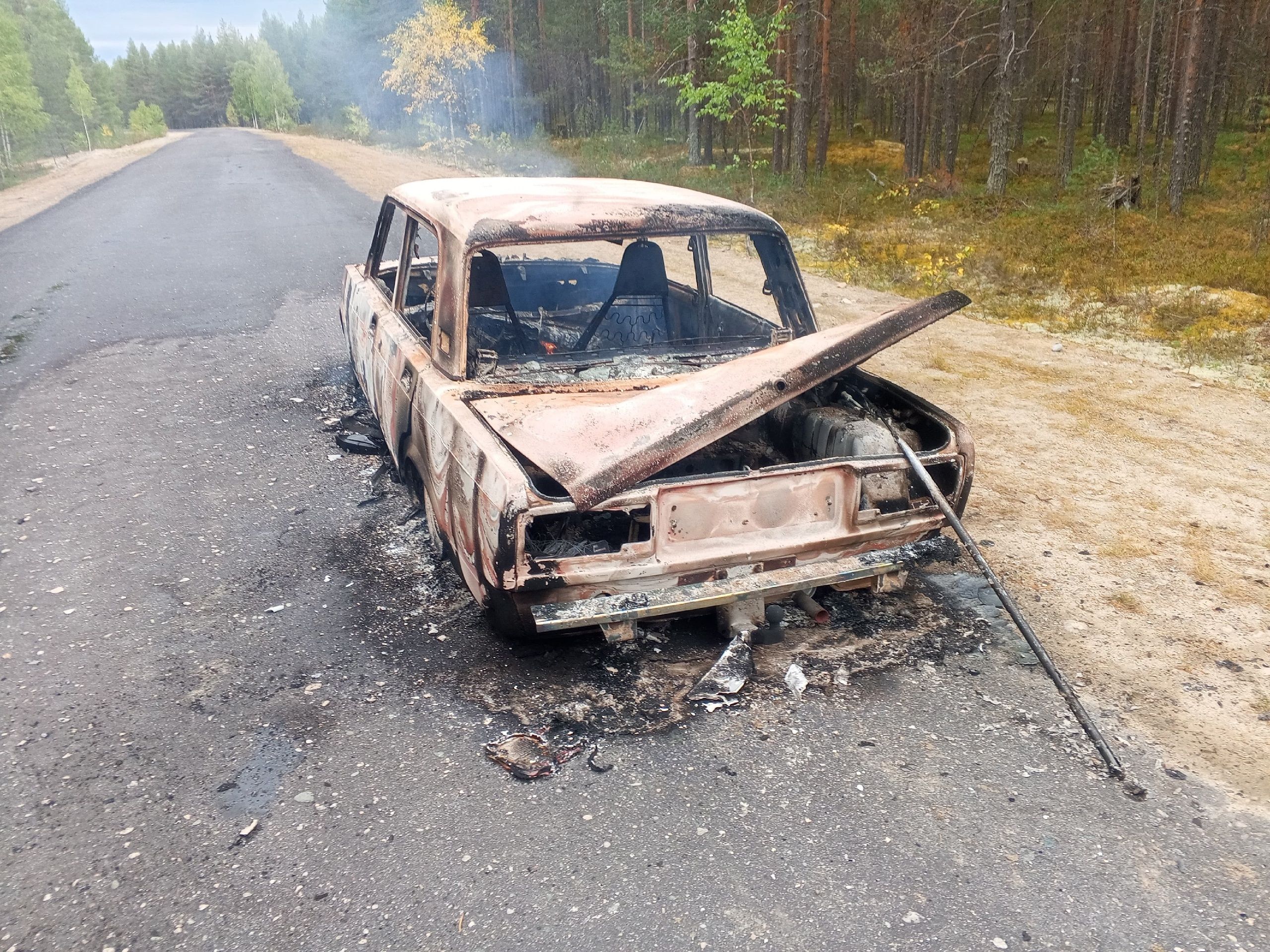 17 сентября на трассе в Калевальском районе Карелии пожар уничтожил легковой автомобиль. Фотографии с места происшествия опубликовало сообщество ГКУ РК «ОПС по Калевальскому району».