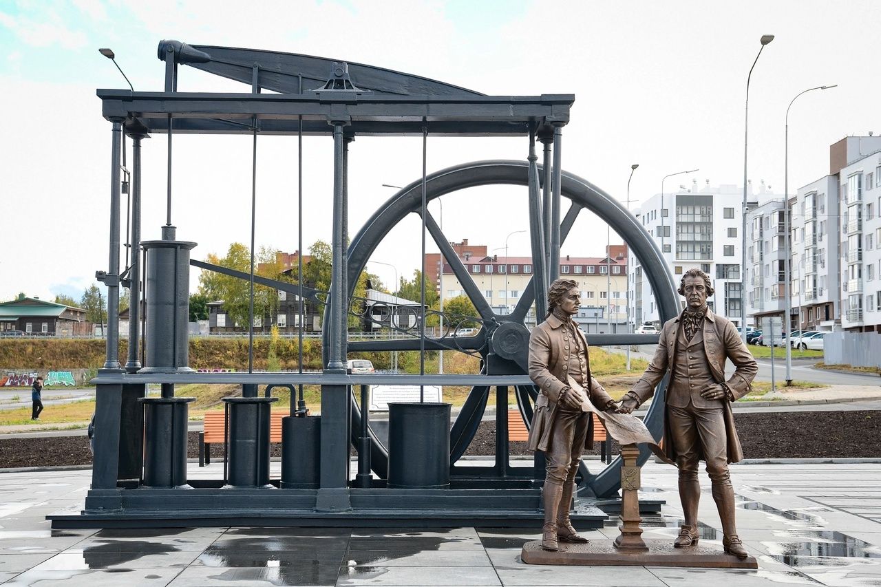 Более 230 лет назад на Александровском заводе в Петрозаводске была запущена первая паровая машина. В производстве паровых машин принимали участие русские механики и английские инженеры, их собирательный образ и запечатлели в скульптуре.