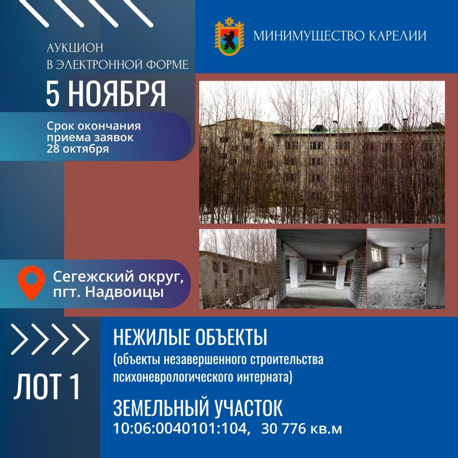 Объявление об аукционе появилось в группе министерства и на портале ГИС «Торги». Недостроенный интернат в поселке Надвоицы Сегежского района продается вместе с земельным участком. Общая площадь составляет 30,7 тыс. кв. м. Начальная цена торгов — 1,72 млн рублей.