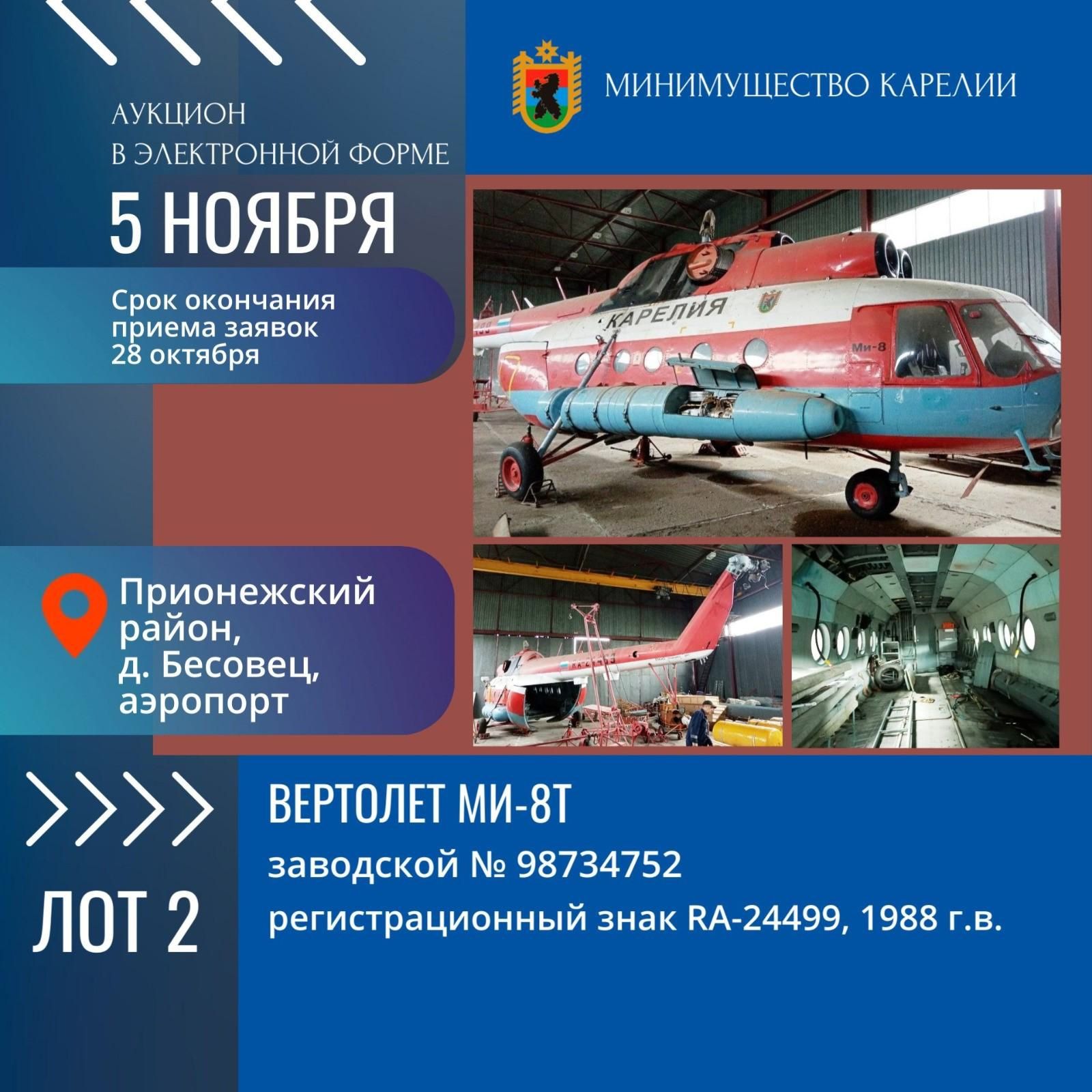 Вторым лотом выставлен вертолет МИ-8Т 1988 года выпуска. Он в настоящее время находится в аэропорту Бесовец. При этом вертолет находится в нерабочем, разукомплектованном состоянии. Начальная цена продажи – 3 955 000 рублей.