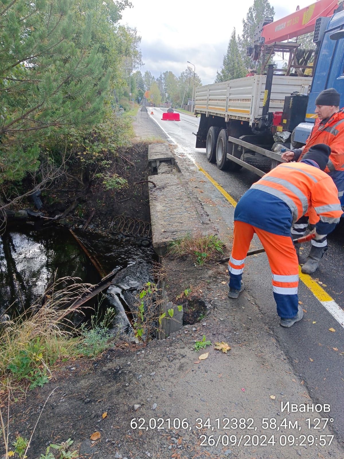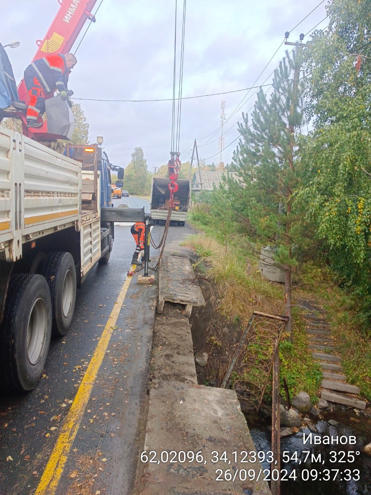 Силами подрядной организации ООО Кондопожское ДРСУ оперативно были проведены работы по восстановлению пешеходной части моста, колесоотбоя, перильного ограждения.