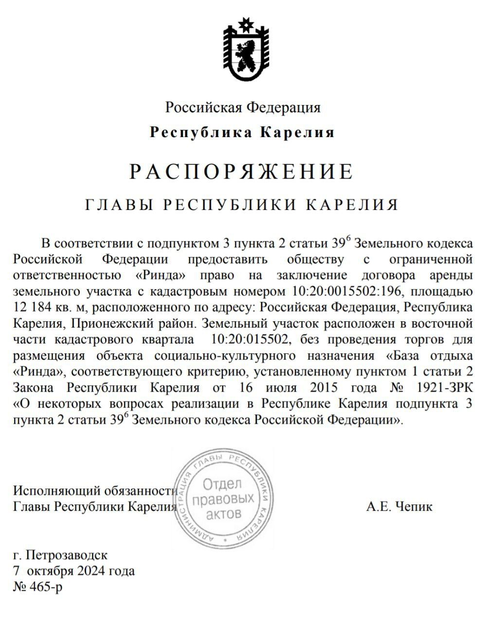 Именно в разгар конфликта между гостевыми домами «Тало Ринда» и жителями местечка Ринда в Прионежском районе на полуострове между озерами Сургубское и Укшозеро, премьер-министр правительства Карелии Александр Чепик подписал распоряжение о выделении без проведения торгов земельного участка под объект социально-культурного назначения «База отдыха «Ринда».