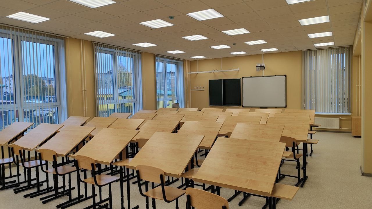 Для организации образовательной деятельности основного общего среднего образования предусмотрена классно-кабинетная система. В кабинетах имеются интерактивные доски. В специализированных кабинетах для учеников предусмотрены специализированные столы (компьютерный, лингафонный, лабораторный с сантехникой и подводкой электричества, стол для черчения и рисования). При кабинетах биологии, физики, химии, информатики, искусств выполнены лаборантские, при кабинете ОБЖ – помещение стрелкового лазерного тренажера и лаборантская.