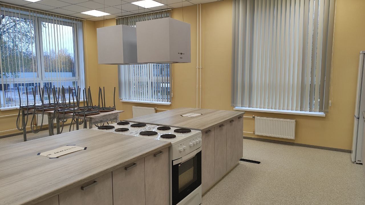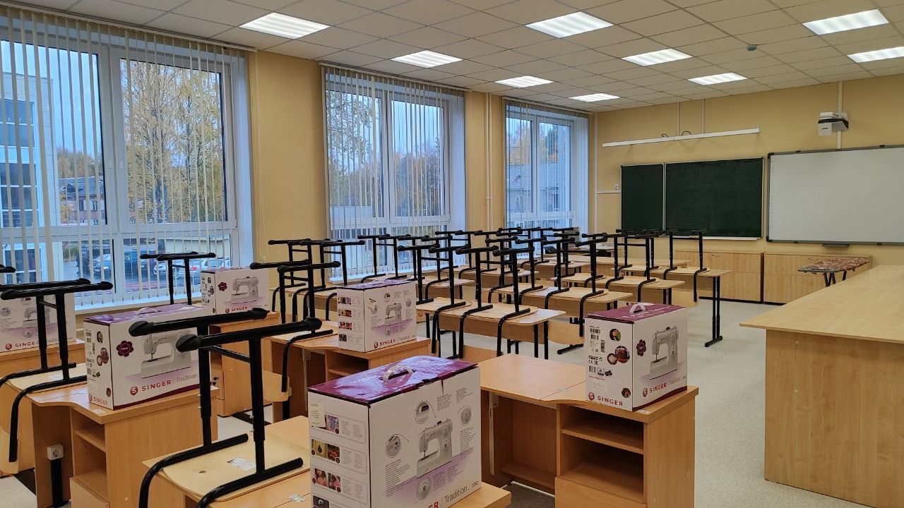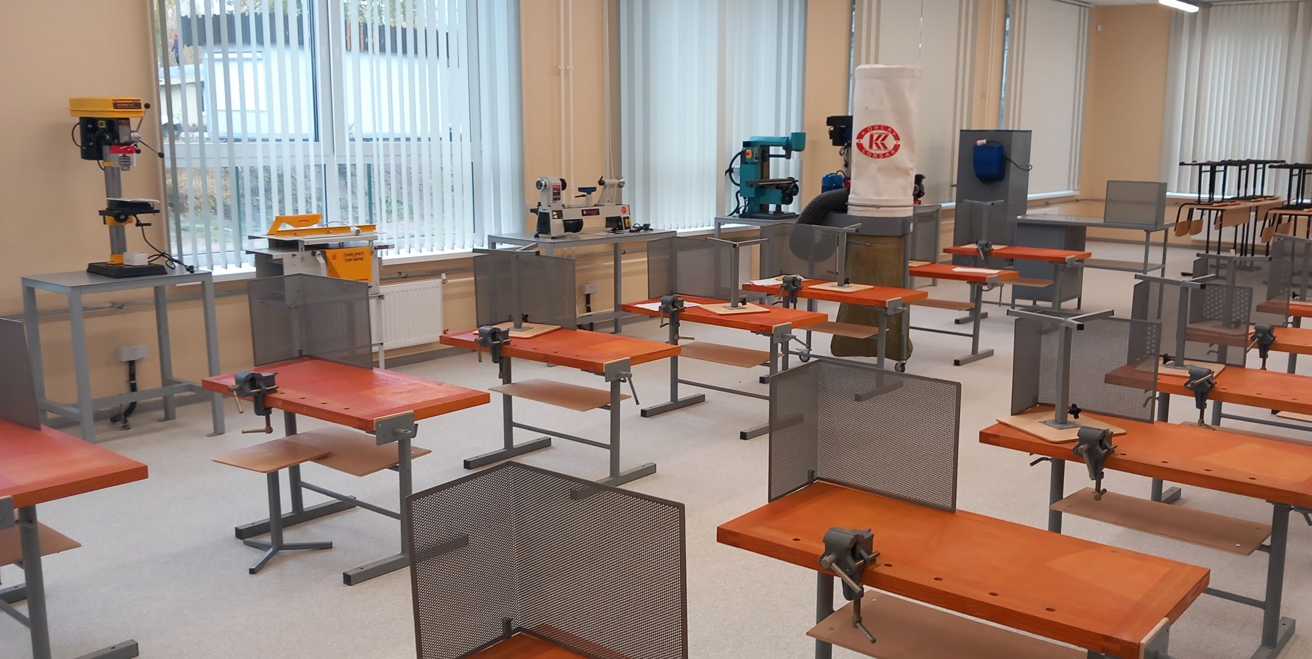 Для занятий по труду выполнены комбинированные мастерские по обработке древесины и металла, а также кабинеты домоводства (кройка и шитье, кулинария). В каждой мастерской имеется учебная зона со столами для учеников, рабочим местом учителя и школьной доской, и зона практики, оснащенная верстаками, станочным (сверлильным, точильным и т.п.) оборудованием, инструментами, приспособлениями, учебно-наглядными пособиями.