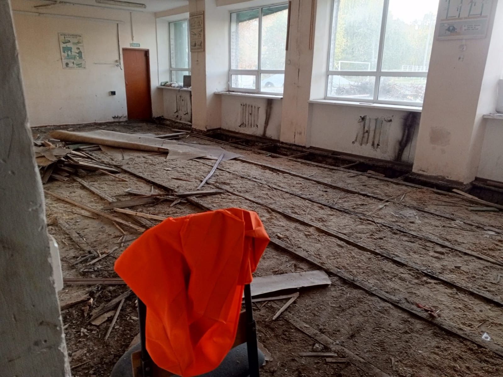 Рабочие вынесли весь накопившийся мусор, произвели монтаж стропил и мауэрлатов на кровле, демонтировали кровлю, парапет из кирпичной кладки над спортивным залом, старую систему отопления, залили стяжку пола на 2, 3 этажах, произвели демонтаж, приступили к электромонтажным работам, ведется подготовка к монтажу лесов для демонтажа старого утеплителя, разбирают полы в мастерских и пищеблоке.