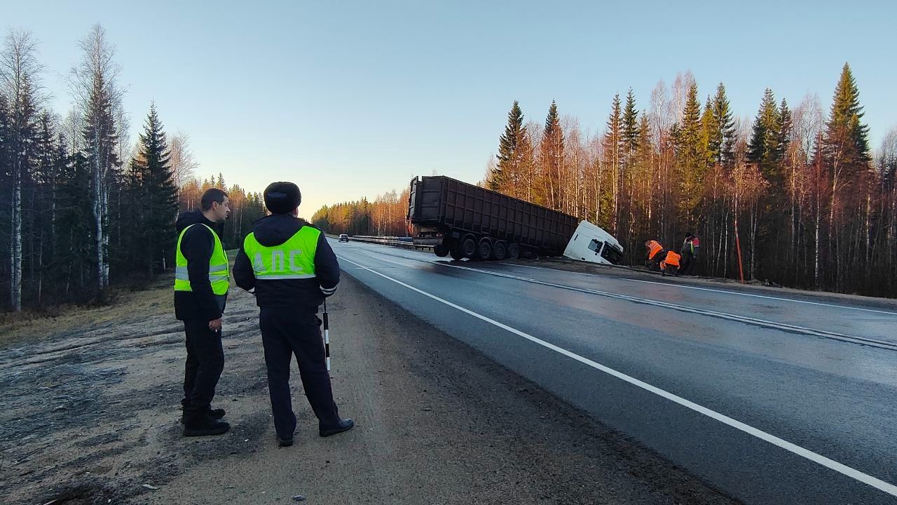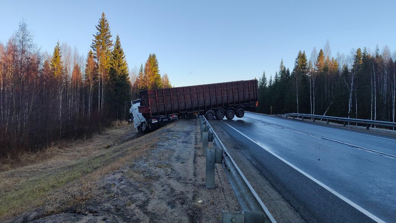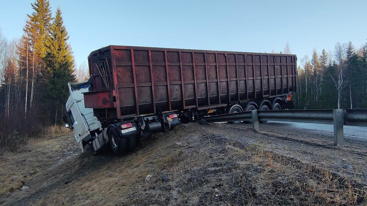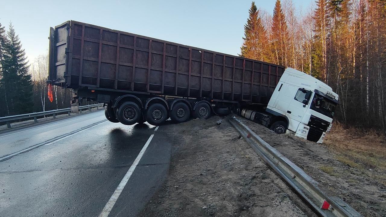 Фура с контейнером едва не съехала в реку Уница в Кондопожском районе утром 29 октября.