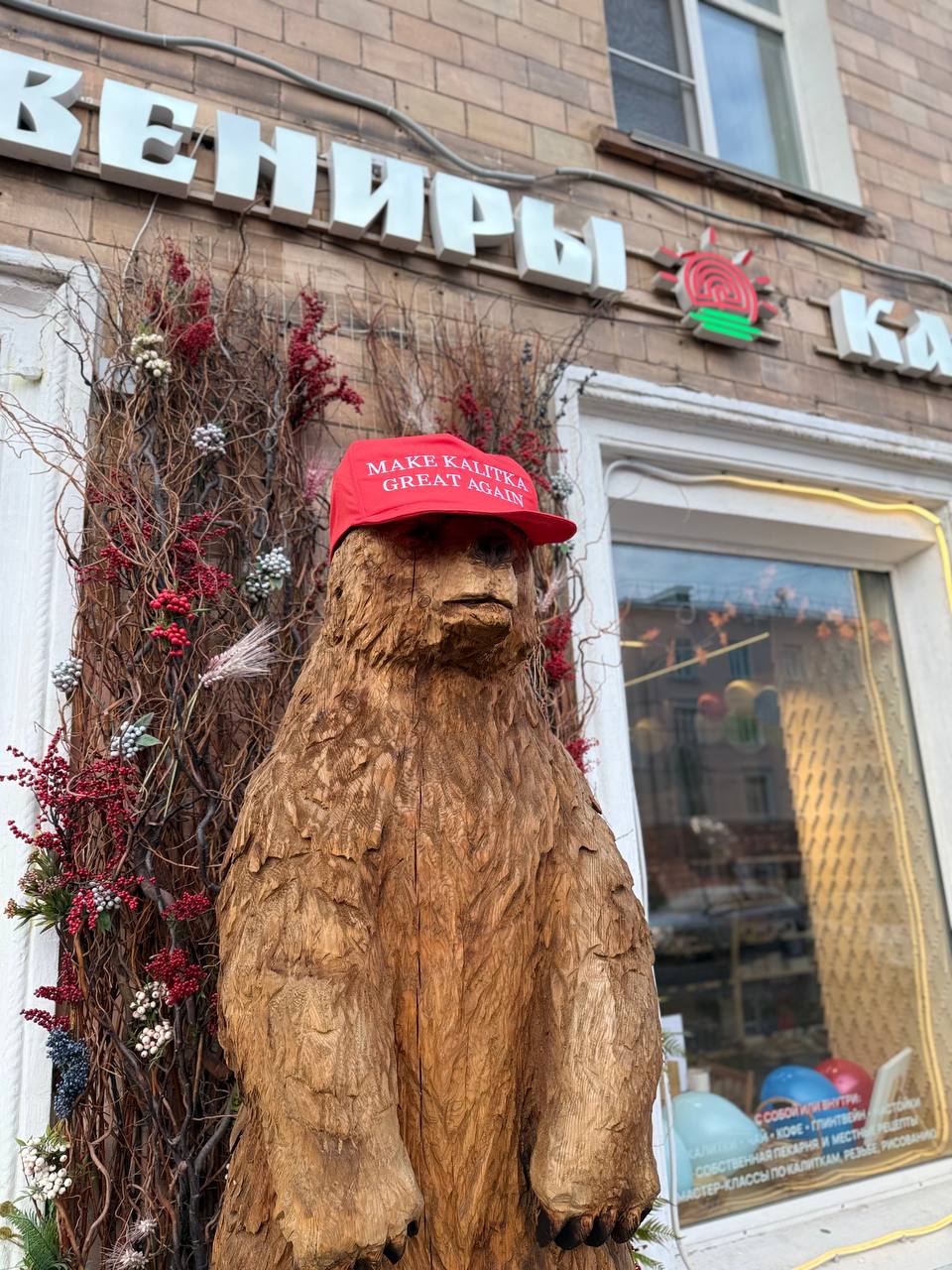 Make kalitka great again – гласит слоган на кепке деревянного медведя, который установлен около калиточной в центре Петрозаводска. Фото прислали наши подписчики.
