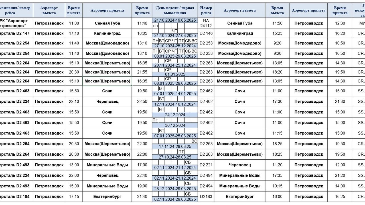 Опубликовано обновленное расписание аэропорта в Петрозаводске Новости Общество 20 ноября, 2024 09:00 Аэропорт Петрозаводска опубликовал обновленное расписание регулярных рейсов. Пассажиров просят внимательно ознакомиться с новой информацией. Время для каждого аэропорта указано местное. Обратите внимание, что в расписании возможны изменения, включая время вылета, — говорится в сообщении. Напомним, ранее в аэропорту Петрозаводска открылась комната матери и ребенка.