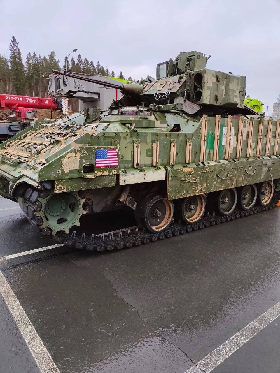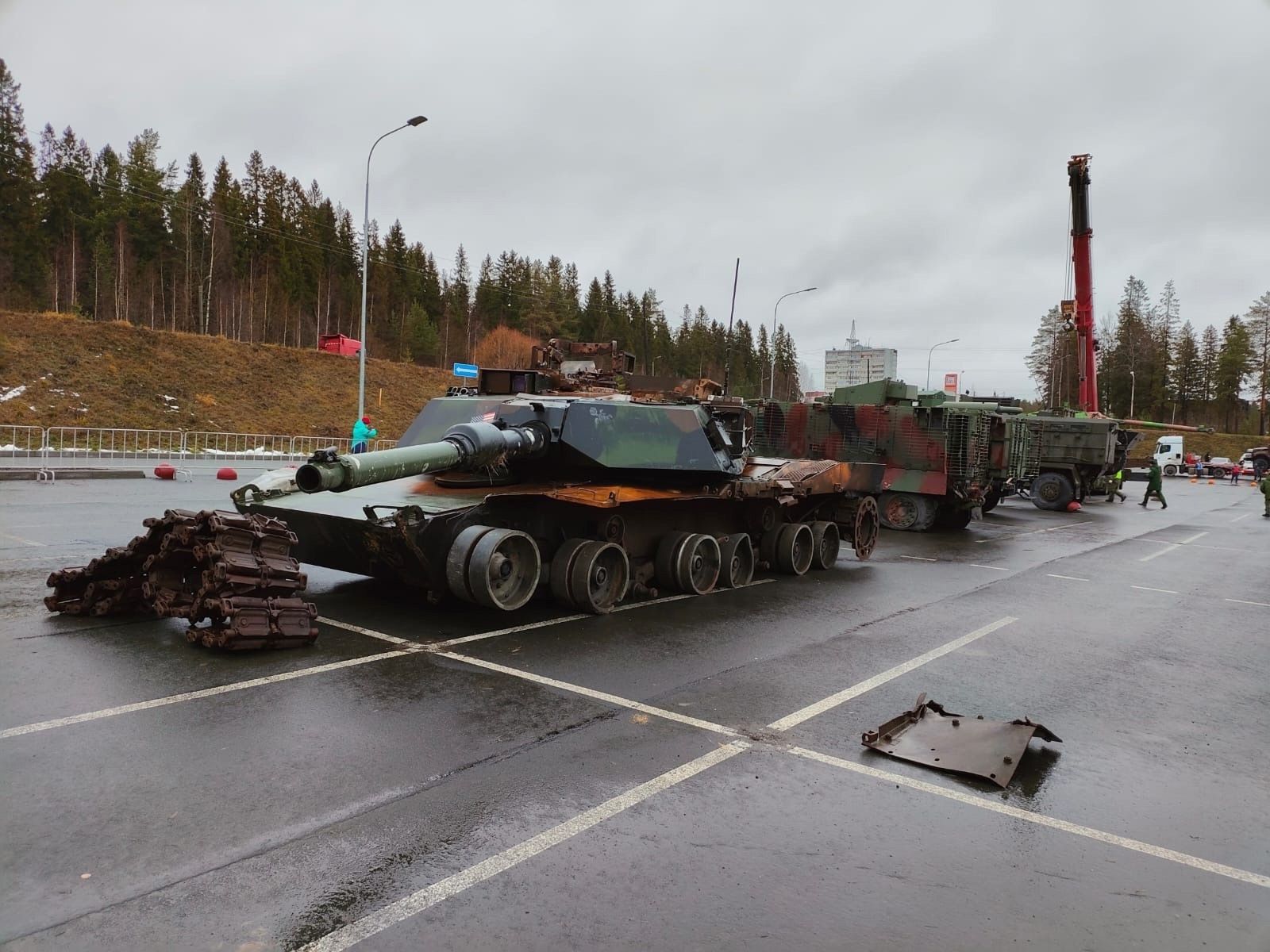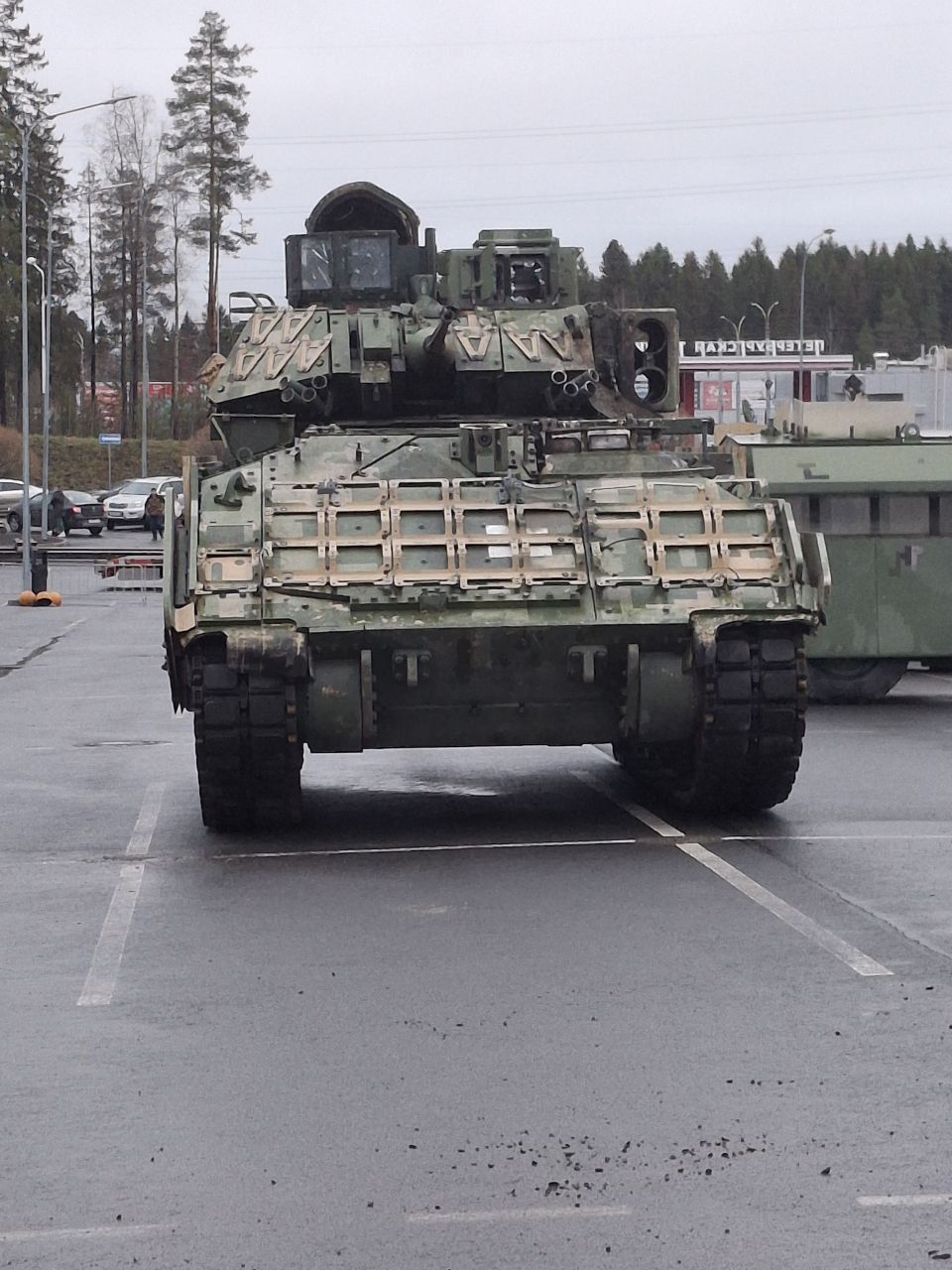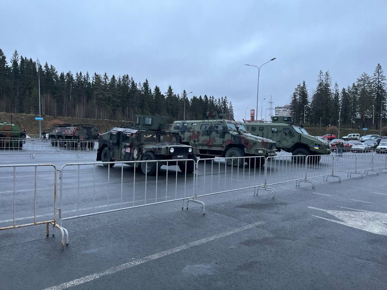 Технику привезли из зоны СВО и выгрузили на стоянке около данного торгового центра. В списке БМП, танки, бронемашины производства США, Великобритании, США и других западных стран. Вся техника – трофейная, подбитая в зоне СВО.