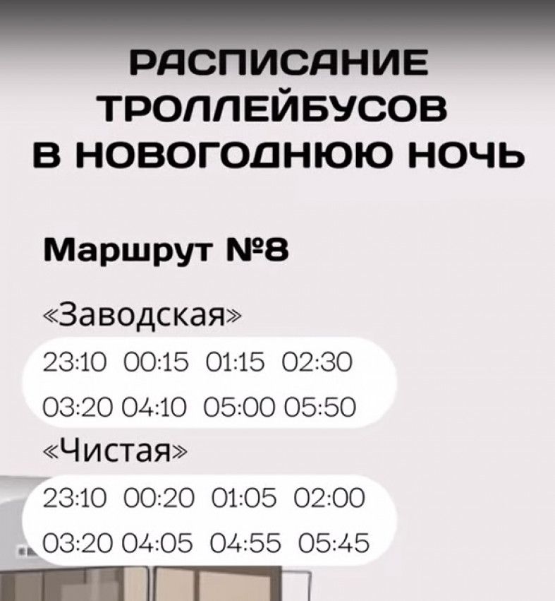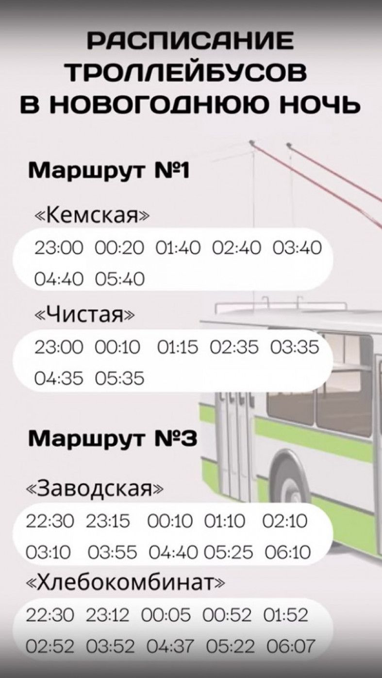 Опубликовано расписание троллейбусов в новогоднюю ночь. В последующие праздничные дни троллейбусы будут работать по графику выходного.