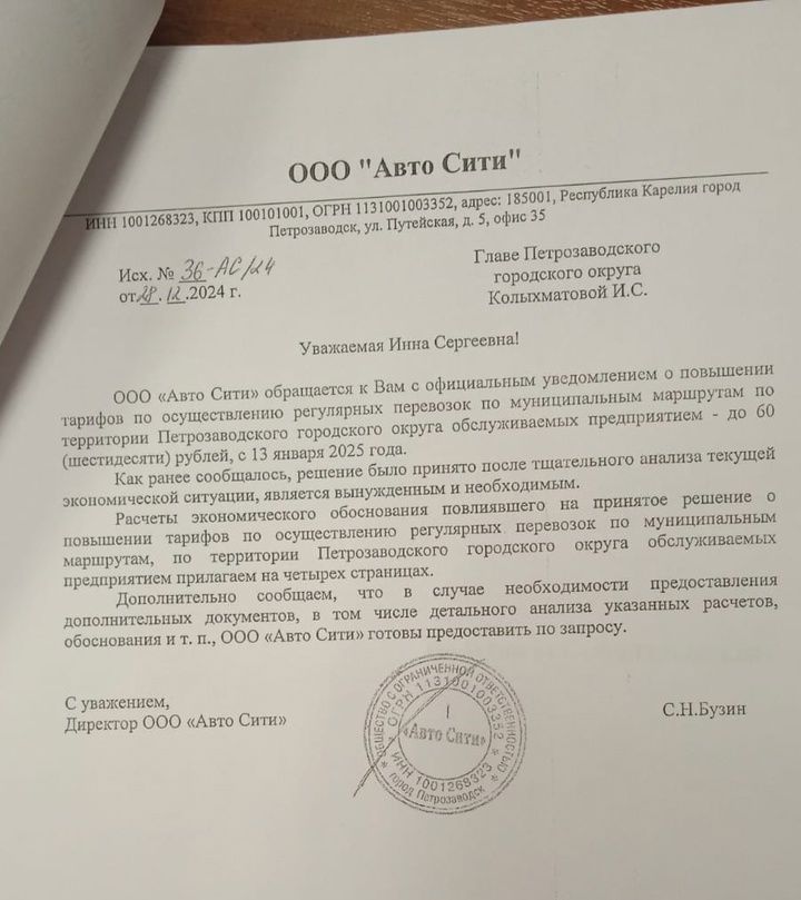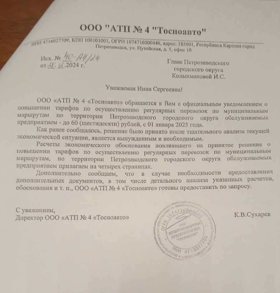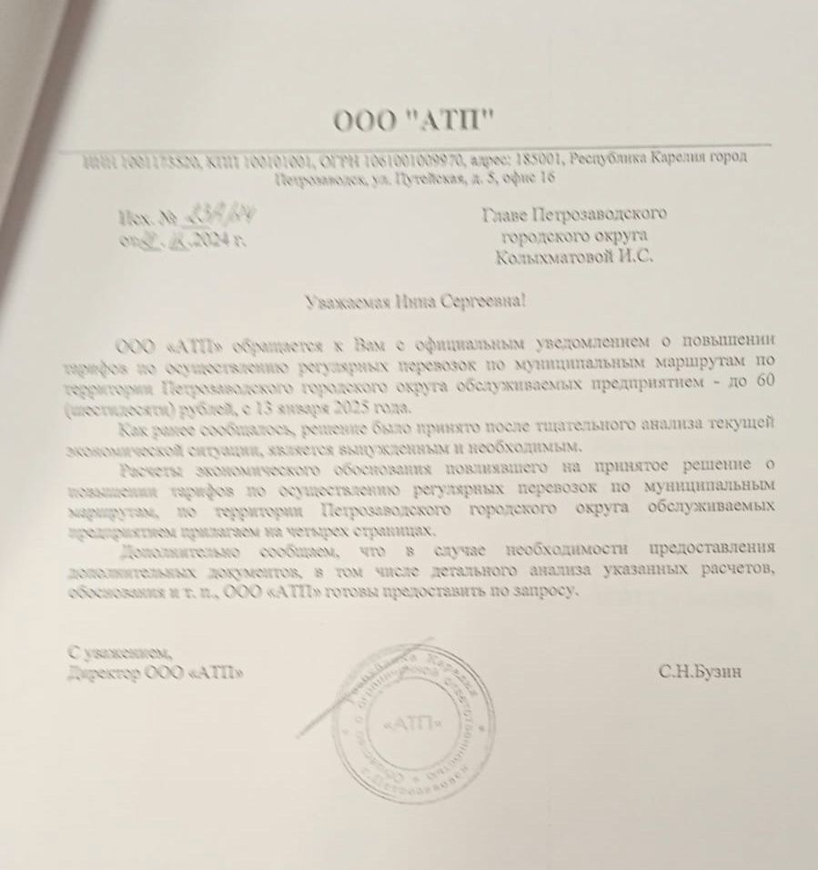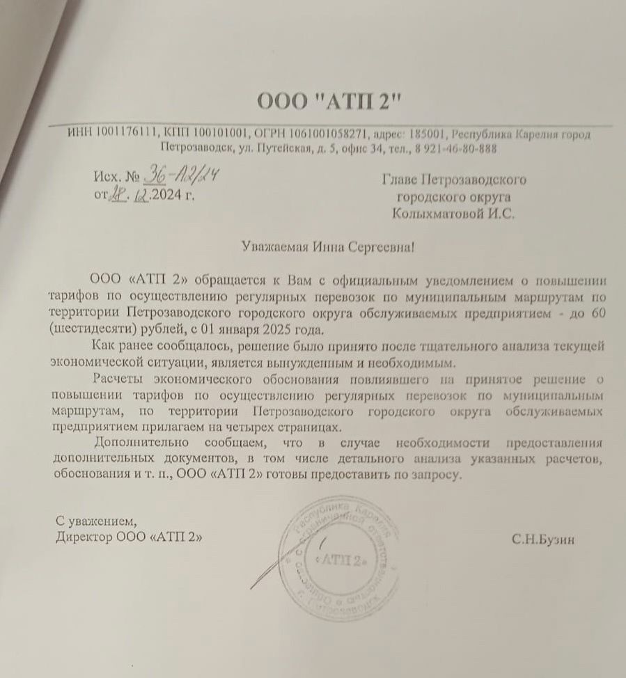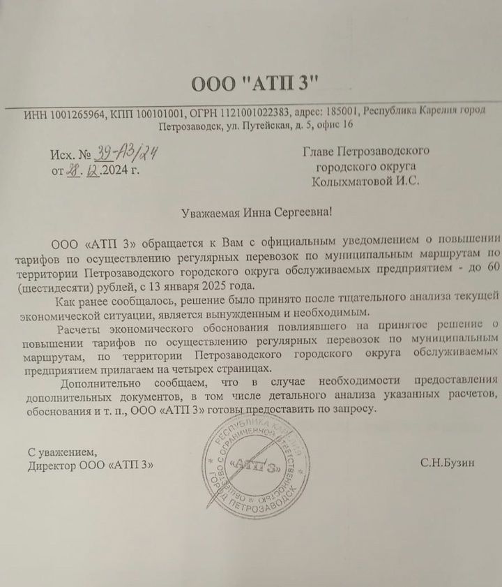 Компании «АТП» (маршруты №2, 5, 8), «АТП 2»(№14), «АТП 3» (№10, 19), «АТП №4 «Тосноавто» (№ 17, 27 и 29), «Авто Сити» (№ 12) и «Транспортная компания» (№ 21 и 22) сделали своеобразный новогодний «подарок» петрозаводчанам, уведомив администрацию города о повышении цены на проезд с 1 января и с 13 января.