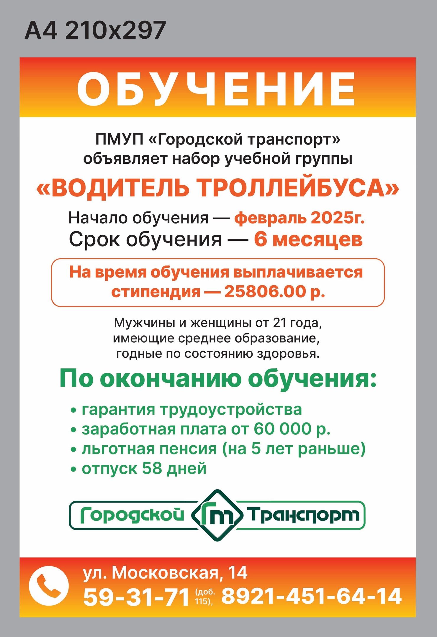 Набор в учебную группу «Водитель троллейбуса» объявило предприятие «Городской транспорт».