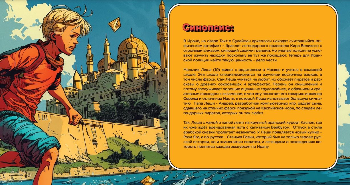 Нашему порталу Иван добавил, что проект получил поддержку Министерства культуры России. Есть партнеры из Ирана, которые будут помогать в съемках. По жанру это будет семейно-приключенческий фильм о приключениях российского 10-летнего мальчика Леши, который случайно оказывается в эпицентре кражи редкого алмаза. По сценарию, мальчик должен обыграть банду грабителей.