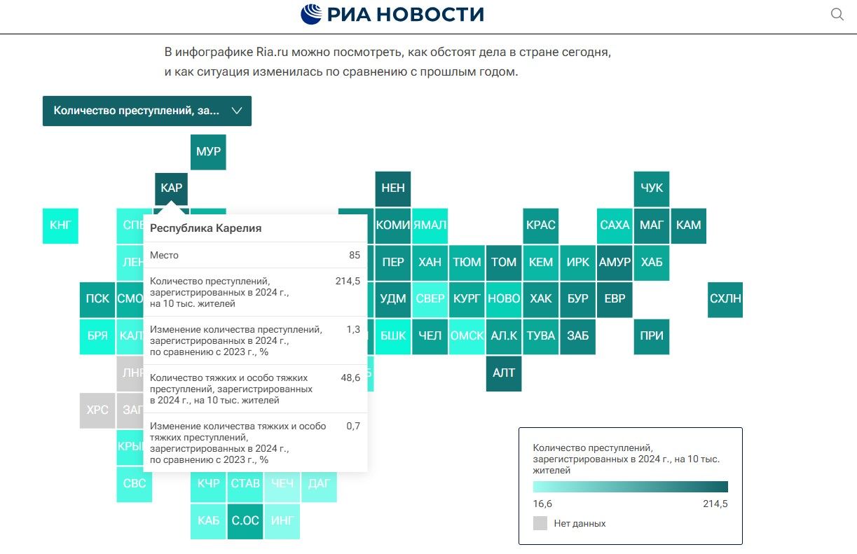После Карелии в списке криминальных регионов оказались Ненецкий автономный округ и Республика Алтай, где в 2024 году также было зарегистрировано более 200 преступлений на 10 тыс. жителей.