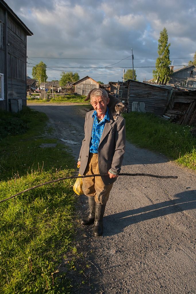 Серые дома российской глубинки — не самый радостный пейзаж. Вдруг дорогу быстрыми шагами прямо перед машиной перешел мужичок с удочкой. На плечах — кошка.