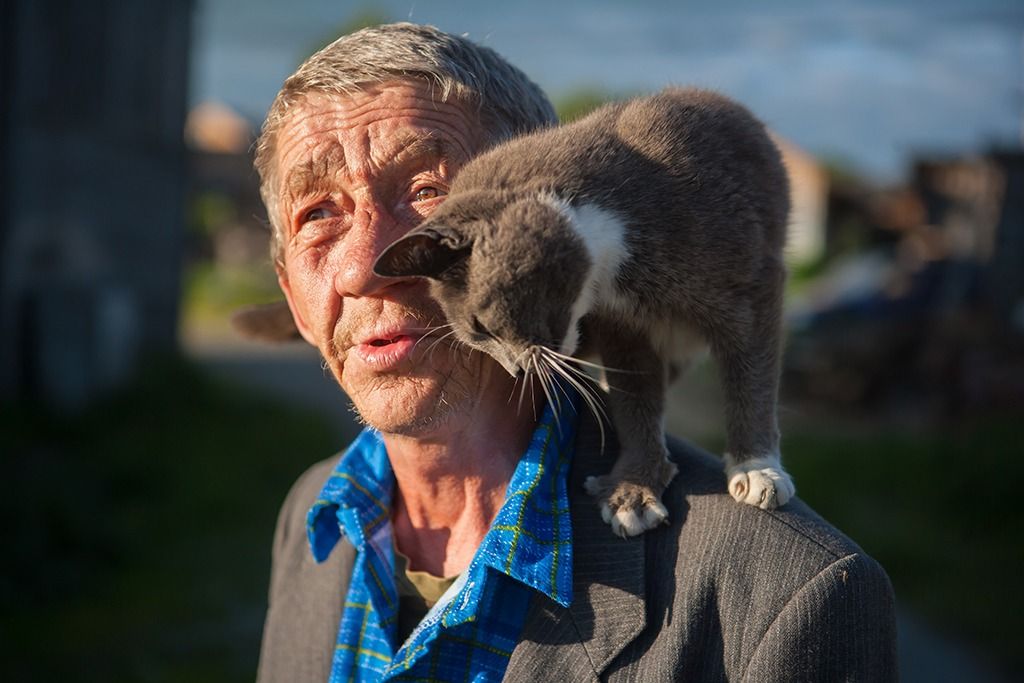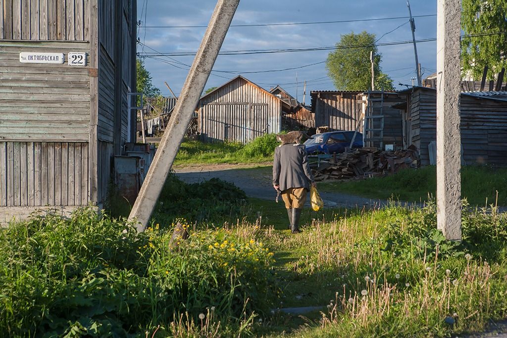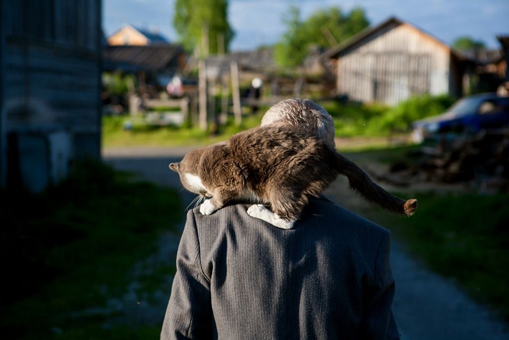 Серые дома российской глубинки — не самый радостный пейзаж. Вдруг дорогу быстрыми шагами прямо перед машиной перешел мужичок с удочкой. На плечах — кошка.