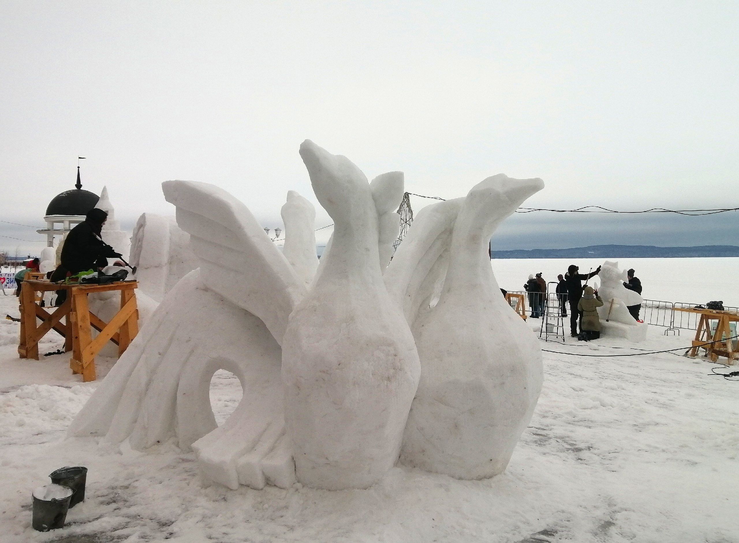 Как раз гусей-разведчиков команда и создает из снега. В этом году, по признанию мастеров, снег не самый простой материал.