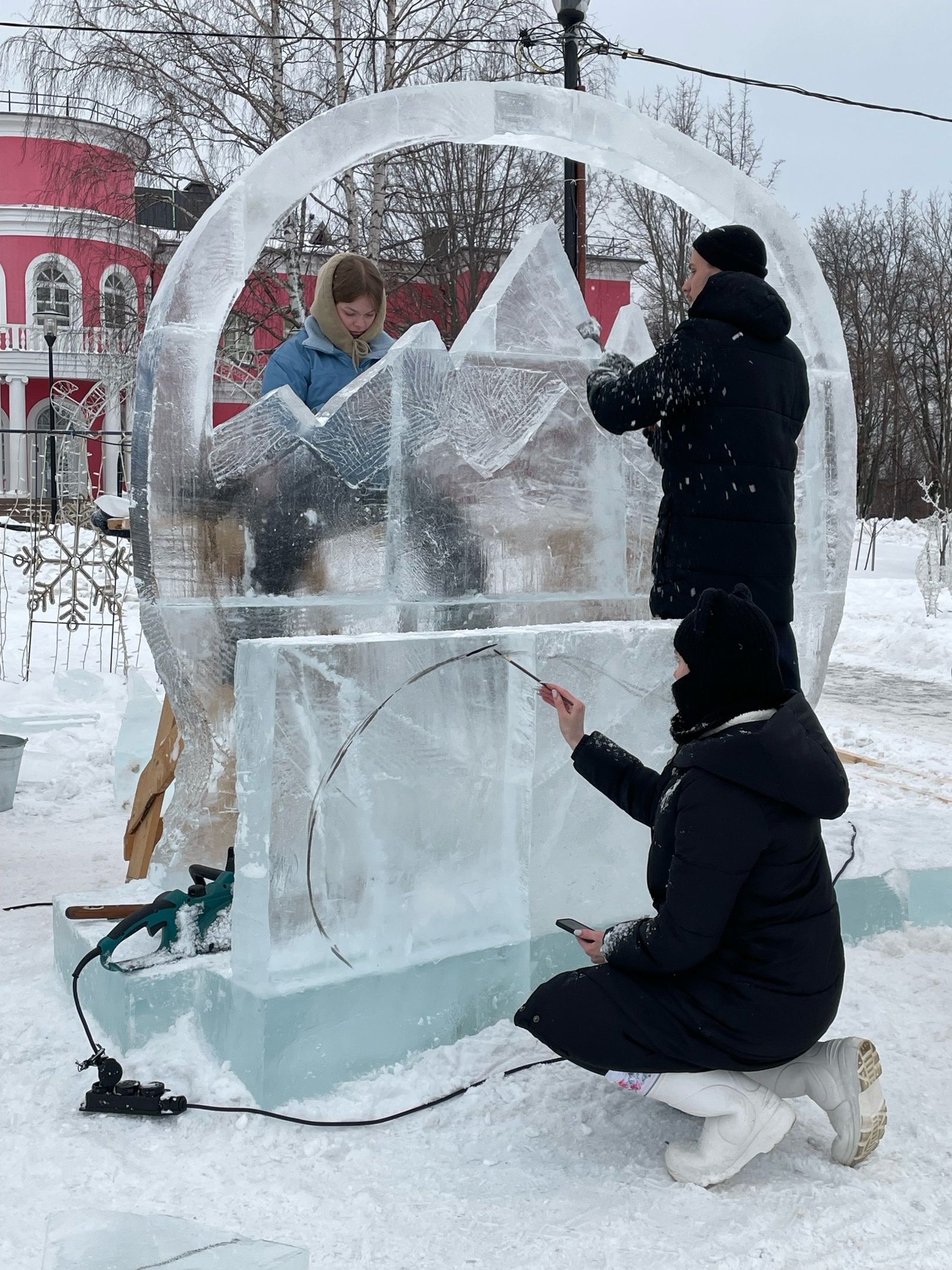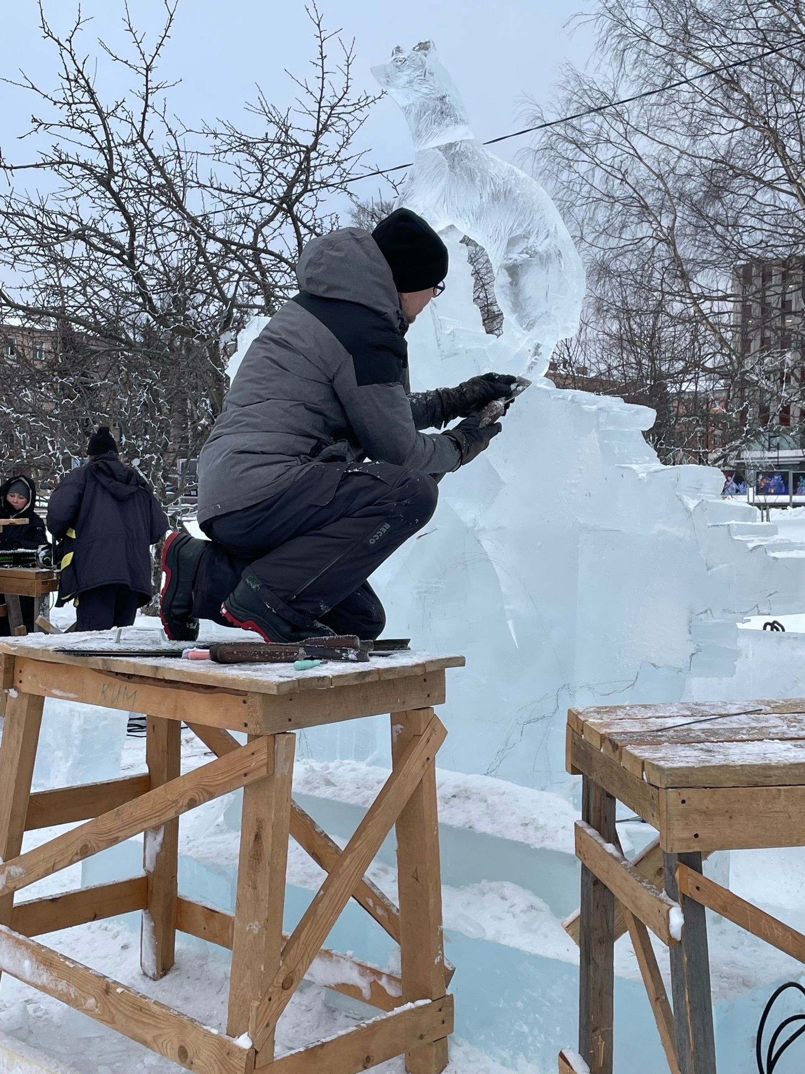 На лёд в этом году вышли первый раз, — рассказывают участники. – В прошлом году был снег, большой куб, несколько раз пробовали на маленьких. 3 года подряд участвовали в школе скульпторов, «Ледовая школа», а в этом году — сразу на лед. Работаем целый день, с перерывами на обед, на погреться. Но сегодня последний день, нужно успеть доделать, поэтому будем до утра тут сидеть, до победного!»