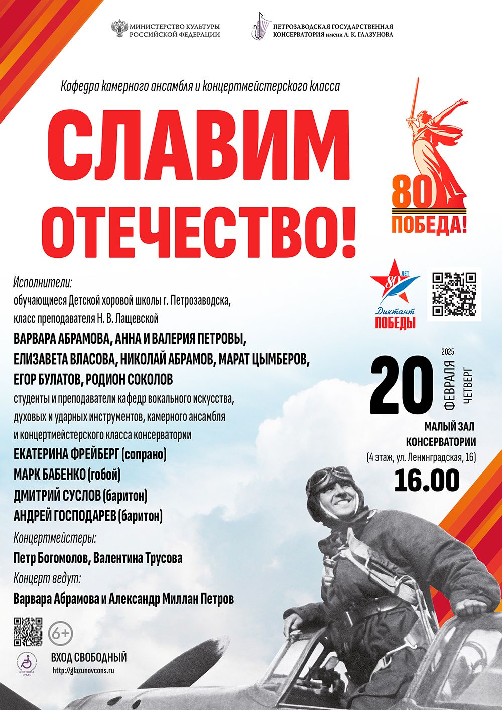 20 февраля 2025 года в Малом зале Петрозаводской государственной консерватории (ул. Ленинградская, 16, 4 этаж) состоится концерт «Славим Отечество!» (6+), посвященный Дню защитника Отечества и 80-летию Победы в Великой Отечественной войне.