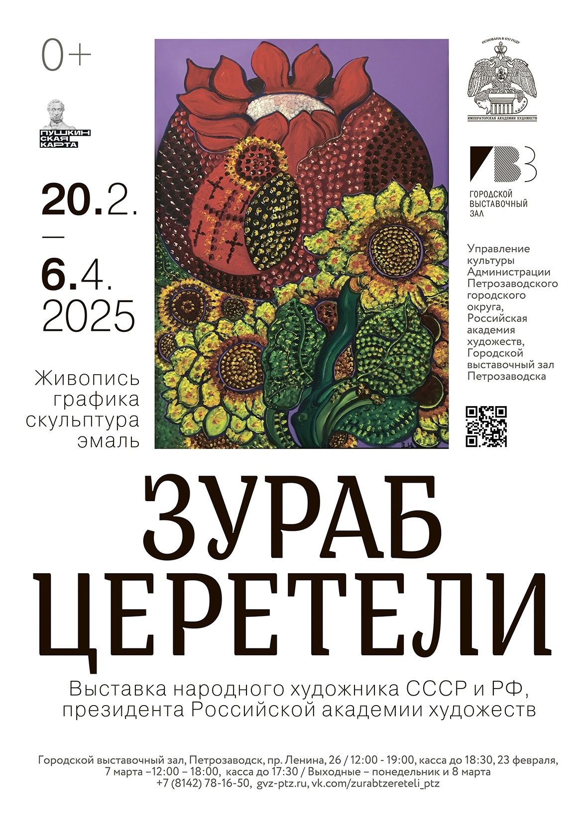 Экспозицию готовят Российская академия художеств и Городской выставочный зал Петрозаводска (0+). Народный художник СССР и РФ, Президент РАХ, один из самых известных и авторитетных в нашей стране мастеров изобразительного искусства Зураб Церетели в январе 2024 года отметил своё 90-летие.