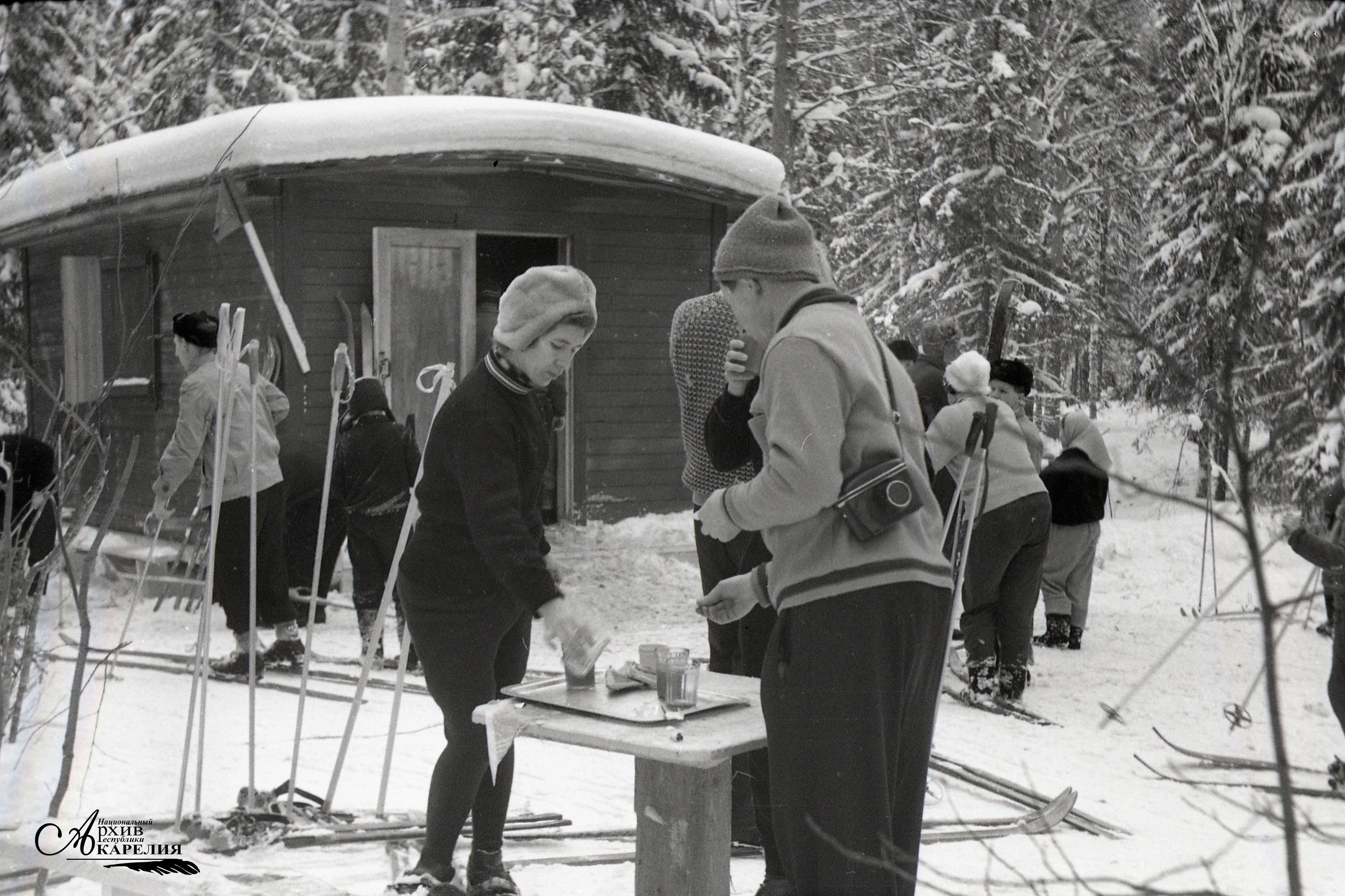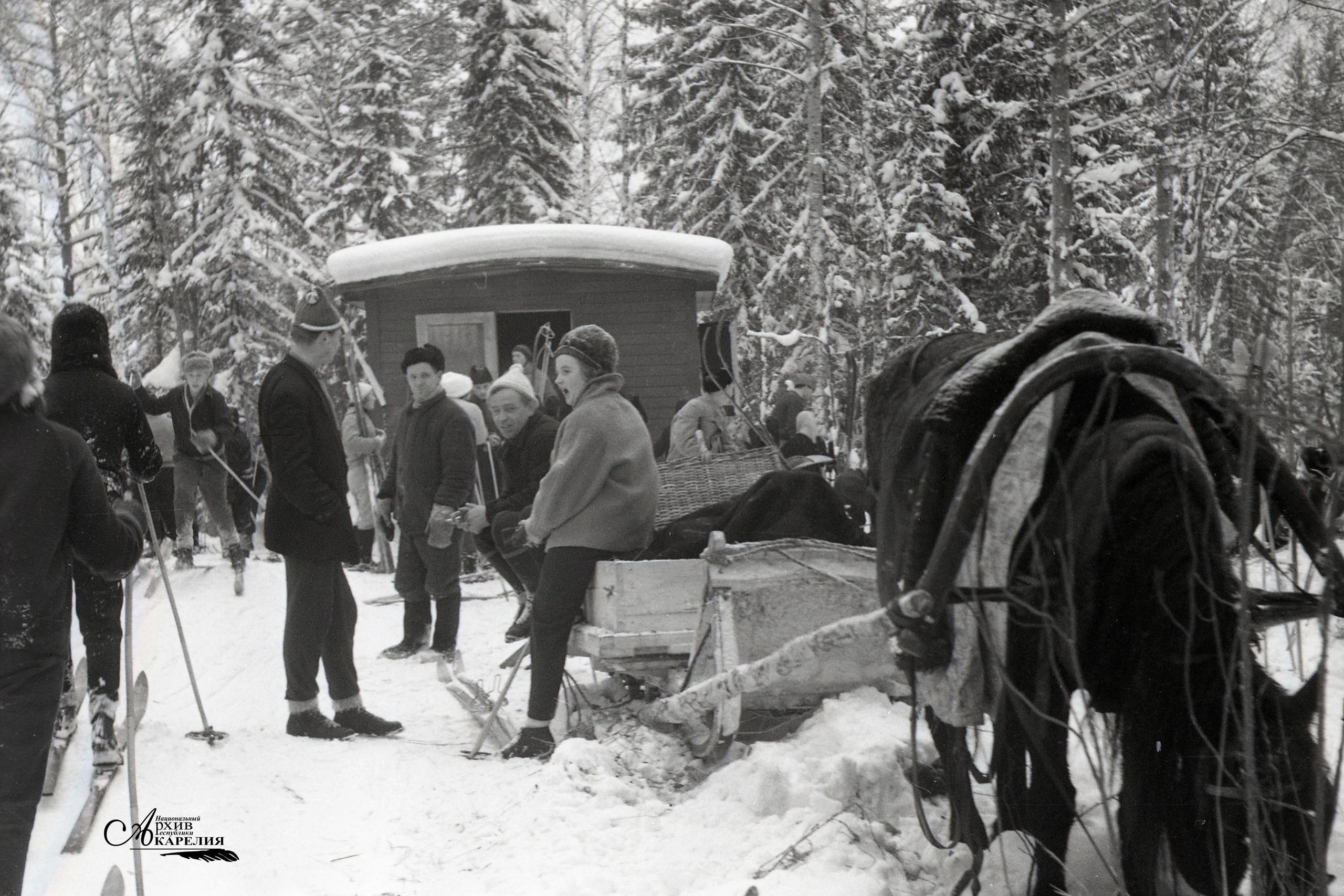 Тогда еще не было чаши, зато место, судя по кадрам, было очень популярным. И не только у лыжников. В лесу была небольшая избушка, видимо, кафе, а чай наливали в граненые стаканы. Снегоходов конечно же еще не было, все привозили лошадками.