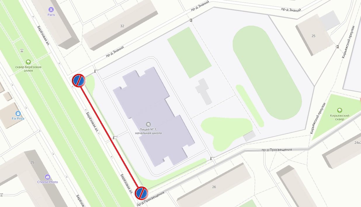 Завтра запретят стоянку транспорта на участке Березовой аллеи от проезда Просвещения до проезда Знаний. Ограничения введут для безопасного подвоза учеников к зданию начальной школы лицея №1.