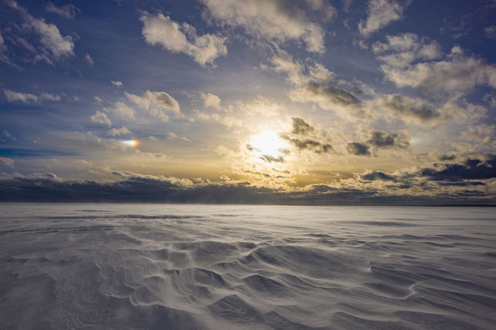 15 марта карельский фотограф Илья Тимин снял редкое атмосферное явление — паргелии, или «ложные солнца», над Онежским озером. Несмотря на пургу, ближе к закату ему удалось запечатлеть яркие оптические эффекты.