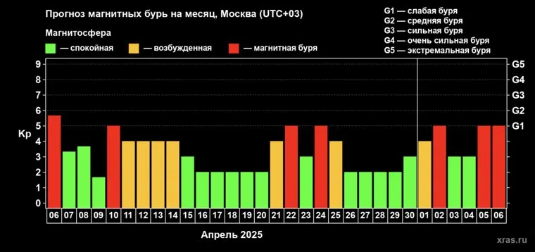 Самые сильные колебания прогнозируются с 6 на 7 апреля, когда интенсивность бури достигнет 6 баллов. Затем активность снизится, начало новой волны ожидается 10 апреля.