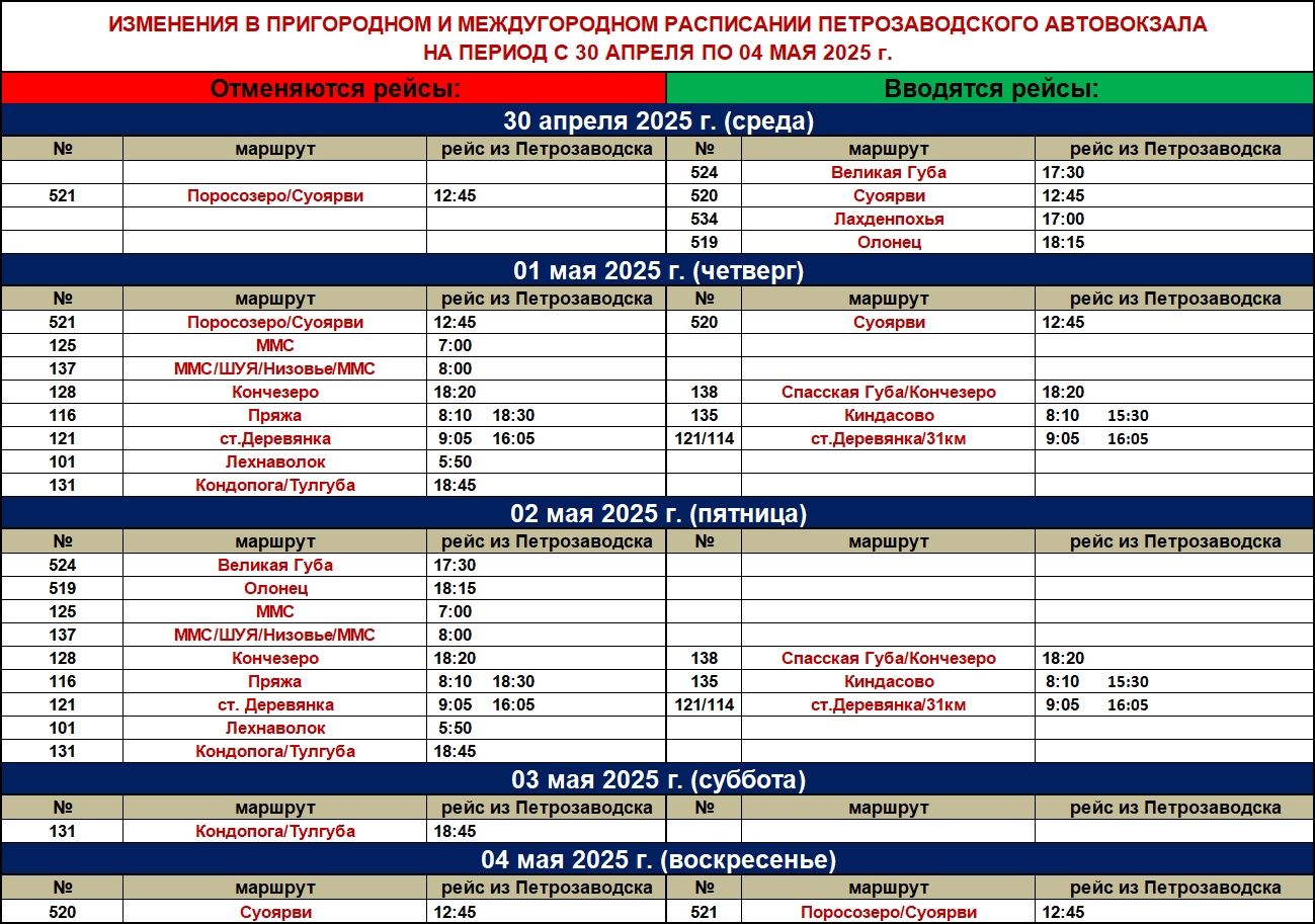 С 30 апреля по 4 мая 2025 года изменится расписание движения некоторых автобусов, сообщает «Карелавтотранс».
